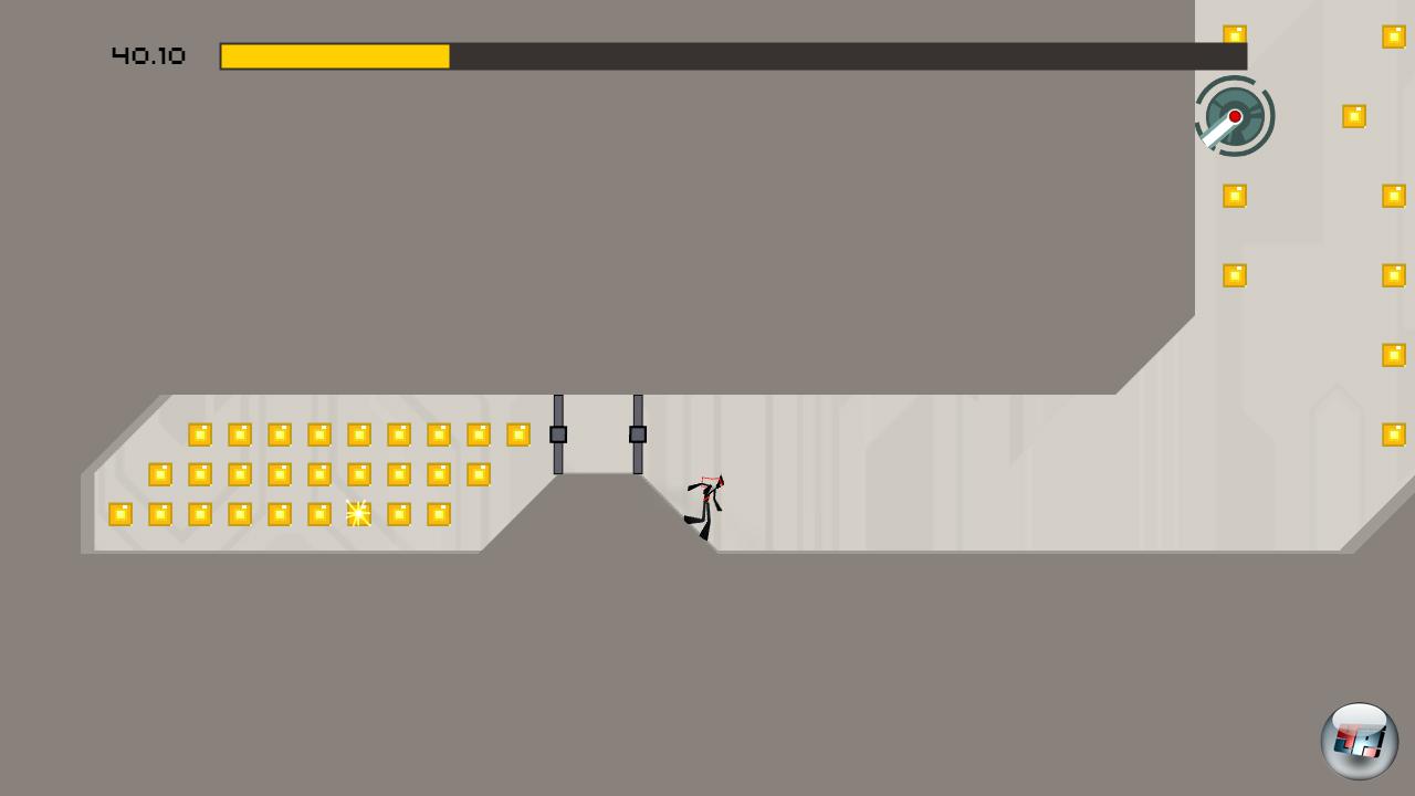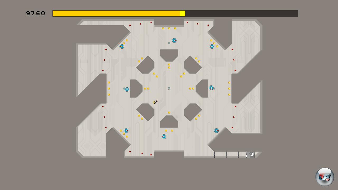 Da das Leveldesign schon vertrackt genug ist, ist es gut, dass die Steuerung so unkompliziert wie nur möglich gehalten wurde: Laufen und Springen sind eure wichtigsten Bewegungen, zusätzlich könnt ihr an Wänden gleiten, um tiefe Abgründe sicher zu erreichen und von Wand zu Wand hopsen, um sie wieder hinauf zu klettern – wichtig ist außerdem noch, dass ihr eure Sprünge präzise in der Luft kontrollieren könnt. All das ermöglicht in Kombination mit einer verspielten Physikengine interessante Manöver: Mit Anlauf an eine Wand hopsen, sich von dort aus mit Schmackes abstoßen, im Flug einen Schalter erwischen, gerade so zwischen zwei gemeingefährlich platzierten Minen hindurch schweben, und all das, während eine verbissene Rakete hinter einem her zischt – alles kein Problem. Diese Art von Geschicklichkeits-um-die-Ecke-Denken ist bitter nötig, denn die Levels werden bereits ab der dritten Episode anspruchsvoll – N+ ist ein klarer Fall für Könner am Pad! Wenn man weiß, was man zu tun hat, dauert ein Abschnitt zwischen fünf und 30 Sekunden. Bis man das rausgefunden hat, kann aber auch schon mal eine frustgeladene halbe Stunde ins Land ziehen.