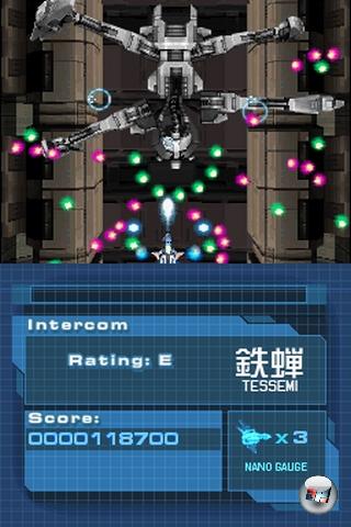 | Auch vertikal scrollend geht in Nanostray 2 mächtig die Hölle ab! Gute Reflexe und Auswendiglernen gegnerischer Angriffsmuster gehören hier zum Spielerlebnis dazu. |