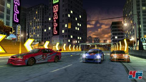 Das Crew-Feature hat dagegen ebenfalls den Weg in die Handheld-Fassung gefunden und wurde sogar gegenüber den anderen Versionen verbessert. Wie gehabt, schickt ihr mit einem Angreifer ein Teammitglied auf die Gegner los oder verschafft euch mit Hilfe des Schleppers einen Geschwindigkeitsvorteil, indem ihr euch in dessen Windschatten über die Strecke „ziehen“ lasst. Neu hinzugekommen ist die Unterklasse des Mechanikers, der euch in den Rennen einen Leistungsschub beschert. Daneben dürft ihr einen Vollstrecker in eure Crew aufnehmen: Dieser legt auf Befehl fiese Nagelbänder aus, die jedem die Reifen aufschlitzen, der drüber fährt – euch mit eingeschlossen, also solltet ihr immer die Augen offen halten. Musstet ihr euch auf den Konsolen vor jedem Rennen auf ein Crewmitglied und damit nur eine Fähigkeit festlegen, dürft ihr auf der PSP gleich mit zweien loslegen und deren Hilfestellungen nach Belieben aktivieren – ein Element, das ich mir auch auf den anderen Systemen gewünscht hätte. Trotzdem fragt man sich auch hier, warum ihr den Rennsieg verdient, wo doch jeder Schlepper offensichtlich deutlich schneller unterwegs ist als ihr selbst – egal, wie viel ihr an der Kiste rumschraubt. Tuning ist auch auf der PSP noch ein zentraler Bestandteil, mit dem ihr euren Flitzer z.B. mit Motoren- und Fahrwerksupgrades sowie Lachgas-Einspritzung und anderen Spielereien ausstattet. Nicht zu vergessen die zahlreichen Aufkleber und weiteren optischen Schnickschnack, den ihr an der Karosserie anbringt. Auf das coole Autosculpt-Feature müsst ihr auf der PSP aber leider verzichten.