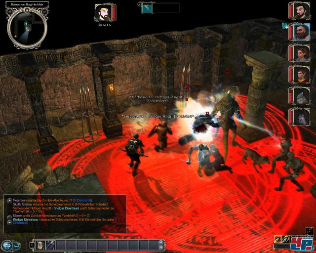 Obwohl es unheimlich motivierend ist, seinen Helden bestimmte Verhaltensweisen wie Beschütze mich, nutze deine Zauber oder Ähnliches zuzuweisen, werden sie nicht immer korrekt ausgeführt. Es gibt allerdings auch gelungene Szenen, wie z.B. beim Knacken der Schlösser oder Fallen entschärfen, wo sich die Diebin ganz von alleine einschaltet und aktiv wird – hier macht NN2 richtig Spaß. Man muss nur aufpassen, dass keiner in der Zwischenzeit in den rot markierten Bereich läuft und vergiftete Armbrustbolzen auslöst…