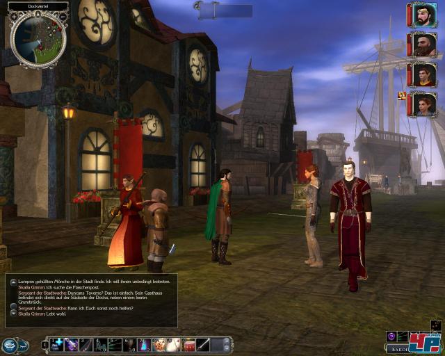 Beim Kampf, der mit seinen Effekten zunächst begeistert, muss man bei genauerem Hinsehen einige Abstriche machen. Waren die Bewegungen in NN noch richtig elegant und ansehnlich, wirken sie jetzt zu grobschlächtig. Der Choreographie fehlen trotz ansehnlicher Abduckmanöver, Rundumschläge und beidhändiger Attacken die letzten Animationsfinessen – manches kommt zu abgehackt, wirkt deplatziert oder zeitlich versetzt. Natürlich ist es nicht leicht, ein auf Würfelergebnisse abgestimmtes System in Echtzeitkämpfe umzuwandeln, aber bei Jade Empire <a class="DYNLINK" onmouseover="DynToolTipp_Show('Klicken für Gameinfos‚)“ onmouseout=“DynToolTipp_Hide(); “ href=“javascript:DynCont_Display(‚Gamefinder‘,’runmod.php?sid=%7BSID%7D&LAYOUT=dyncont_gf&spielid=4510′)“> sieht das Ganze harmonischer und durchgestylter aus. Und wer einmal The Witcher <a class="DYNLINK" onmouseover="DynToolTipp_Show('Klicken für Gameinfos‚)“ onmouseout=“DynToolTipp_Hide(); “ href=“javascript:DynCont_Display(‚Gamefinder‘,’runmod.php?sid=%7BSID%7D&LAYOUT=dyncont_gf&spielid=5553′)“> in Aktion gesehen hat, wird den großen Unterschied in den flüssigen Schwerthieben und Kontern erkennen.