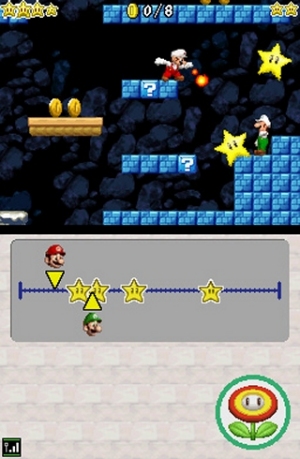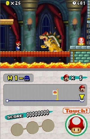 Ha! Keine grundsätzlichen Änderungen also im normalen Bewegungs- und Item-Sortiment, dafür einige Neuzugänge: Mit dem Giganto-Pilz wird man bildschirmgroß und poltert kurzzeitig wie Godzillario durch den Abschnitt. Das sieht nicht nur schweinecool aus, es nutzt auch was – teilweise kann man nur so bestimmte Bereiche zugänglich machen. Allerdings ist auch gefährlich, wenn man alles niederwalzt: Reißt man eine Warpröhre weg, dann bleibt sie auch weg – und damit vielleicht auch die Chance, einen versteckten Abschnitt zu finden. Auf der anderen Seite könnt ihr mit der 20m-Mario-Nummer Leben dazuverdienen – je mehr ihr auf der kurzen Tour de Force kaputt trampelt, desto mehr grüne Pilze kassiert ihr. Das genaue Gegenteil der ersten Anwendung passiert mit dem Mini-Pilz: Mario schrumpft auf Stubenfliegengröße, kann über Wasser laufen und winzige Warpröhren benutzen. Und zu guter Letzt wartet noch der stilsichere blaue Schildkrötenpanzer, mit dem ihr euch, vor gegnerischen Attacken sicher, euren Feinden entgegen werfen könnt – sehr nützlich, aber schwierig zu kontrollieren.Das ist aber auch der einzige Kritikpunkt an der sonst traumhaften Steuerung: Per Digikreuz habt ihr Mario jederzeit voll im Griff, man schmeißt das Spiel an und fühlt sich sofort zuhause – kein großes Reinfummeln, kein Auswendiglernen: einfach loslegen! Mario kann jetzt einen weiten Dreiersprung ausführen, von Wänden abhopsen, an Seilen hangeln bzw. wie Tarzan daran baumeln, sich vorsichtig an Kanten entlang tasten und mit dem Hosenboden voran durch losen Boden brechen – größtenteils aus Super Mario 64 bekannte Moves, die aber in 2D absolut problemlos funktionieren. Vertreter der DS-Features-müssen-genutzt-werden-Fraktion dürften dagegen verhältnismäßig traurig sein: Das Touchpad wird im Hauptspiel nur für die Darstellung der Karte sowie die Anzeige des Spielfortschritts benötigt, außerdem wird da ein Item zwischengelagert (nicht mehr drei, wie es ursprünglich mal geplant war), welches man nach Bedarf einsetzen kann. In der einen Hälfte des zweigeteilten Multiplayermodus dürft ihr dagegen freudig den Stift zücken: Das sind nämlich 24 Minigames für bis zu vier Spieler, für die ihr insgesamt nur ein Modul benötigt – die zwar höllisch viel Spaß machen (Empfehlungen des Hauses: sowohl die Schneeballschlacht als auch das Bob-Omb-