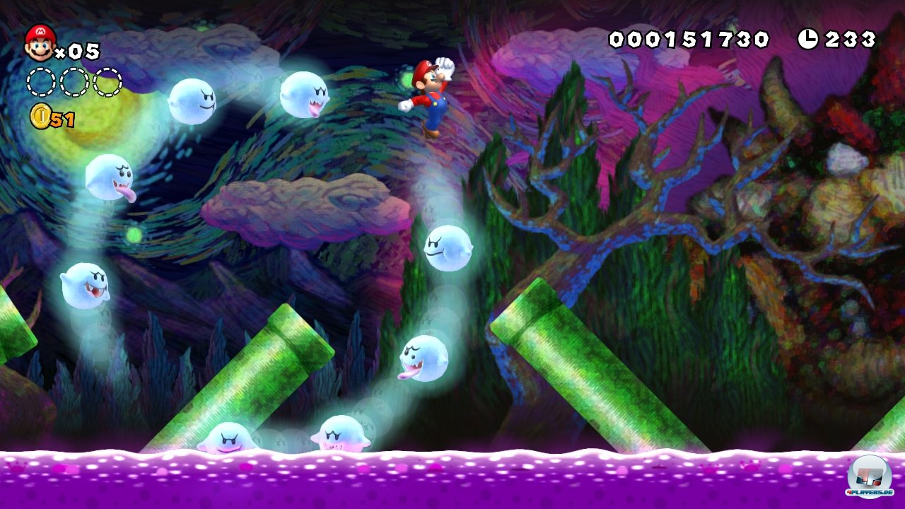 Yoshiiiiiiiii! [GUI_PLAYER(ID=98267,width=,text=Man darf auch wieder kooperativ auf Prinzessinnen-Rettung gehen. Aber bei mehr als zwei Spielern wird’s chaotisch, schnell bricht Anarchie aus.,align=left)] Die Kampagne setzt auf klassisches Mario-Vergnügen: Man hopst durch grüne Auen und die glühend heiße Wüste, blubbert durch Wasserlevels voller bissiger Knochenfische und fieser Strömungen, schliddert durch Eislevels, sucht in Geisterhäusern nach versteckten Gängen und fühlt sich in der Welt der Riesen ganz, ganz klein. Die große und vielfach verzweigte Oberwelt sorgt dafür, dass es keine feste Reihenfolge der Levels gibt – oftmals darf man sich zwischen mehreren Wegen entscheiden, die zu unterschiedlichen Arealen führen. Und wie so oft muss man auch nicht alle Levels meistern, um den Abspann (nebst Prinzesschen Peach) zu Gesicht zu bekommen. Aber, und hier nickt der Mario-Kenner wissend, man sollte das tun. Denn in jedem Abschnitt warten die altbekannten drei Sternenmünzen, zum Teil garstig fies versteckt. Die dienen dieses Mal nicht zum Freischalten von Bosslevels oder Toad-Häusern, sondern sorgen dafür, dass man die neunte Welt erkunden darf.