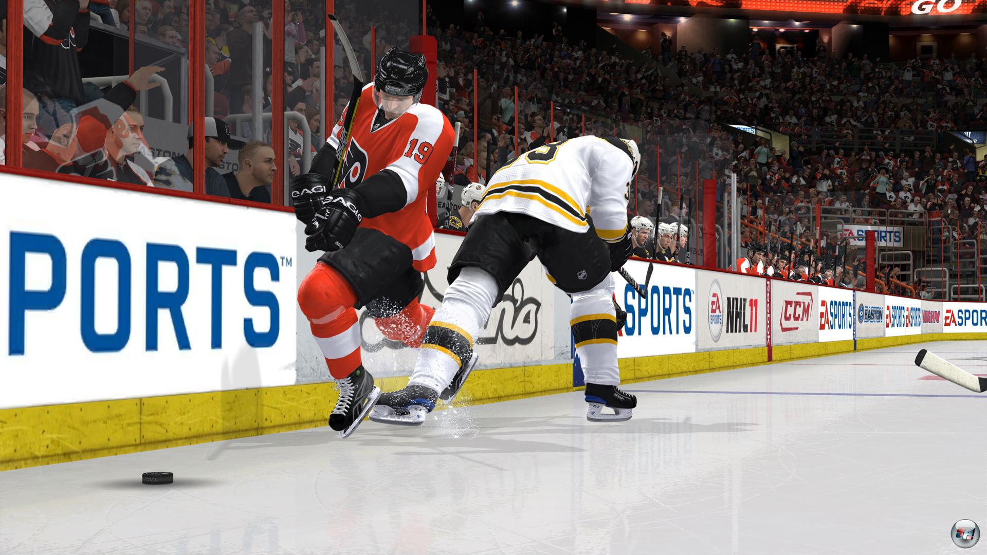Bei den normalen Checks hat sich zwar bis auf etwas mehr animierte Vielfalt, was die Kollisionsauswirkungen angeht, nichts Wesentliches getan – die Einbindung der Physik sorgt zwar für etwas mehr unvorhersehbare Stürze, aber die gab es auch in NHL 10. Aber der Poke-Check lässt sich über die Kombination aus L1/LB plus Stick nach unten kontern: Wer den Verteidiger mit seinem Gefuchtel kommen sieht und das rechtzeitig einleitet, kann den Puck zwischen seinen Kufen sichern – also nicht in der weit abschirmenden Bewegung über X, sondern als eine Art defensiven Deke. Vor allem Kenner des Vorgängers werden diese Möglichkeit zu schätzen wissen, weil man all zu aggressive Gegenspieler damit alt aussehen lassen kann.