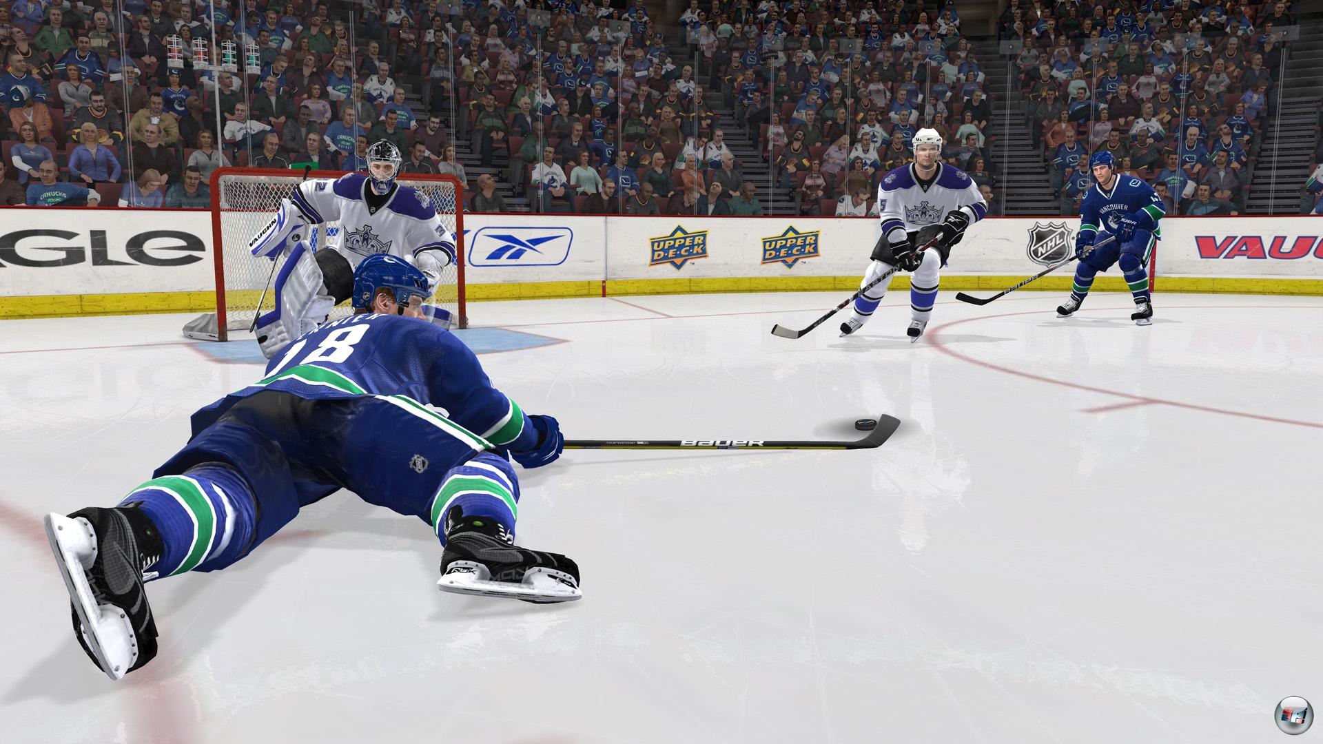So kann man theoretisch und manchmal auch praktisch sehr schöne diagonale Zuspiele in die Tiefe einleiten. Aber selbst Kenner werden sich daran erstmal gewöhnen müssen, denn das verlangt mehr Timing als letztes Jahr und lasche Fehlpässe sind eher an der Tagesordnung als tödliche, zum Ziel jagende One-Timer. Hat man sich aber an diese Mechanik gewöhnt, sind wirklich knallharte Pässe cross über das Eis möglich und ansehnliche Kombinationen. Dass das praktisch nicht öfter passiert bzw. häufiger von Erfolg gekrönt wird, liegt leider an der im Vergleich zur relativ cleveren Defensiv-KI immer noch trägen Offensiv-KI, die sich selbst bei einem Tempogegenstoß nicht gut genug frei skatet, so dass man als Passgeber einfach kein Ziel hat. Warum kann ich meinen Flügelleuten nicht wie in FIFA 11 auf Knopfdruck ansagen, dass sie jetzt bitte vorstoßen sollen?