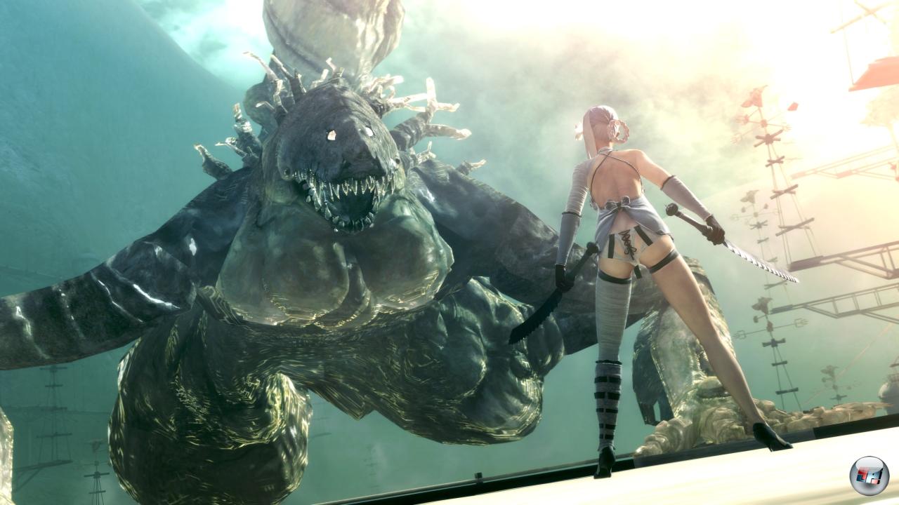 | Kainé (rechts) ist eine der schillerndsten Figuren im Nier-Universum – nicht nur, weil sie auch gefährlichsten Gegnern nur sehr leicht bekleidet gegenüber tritt. |