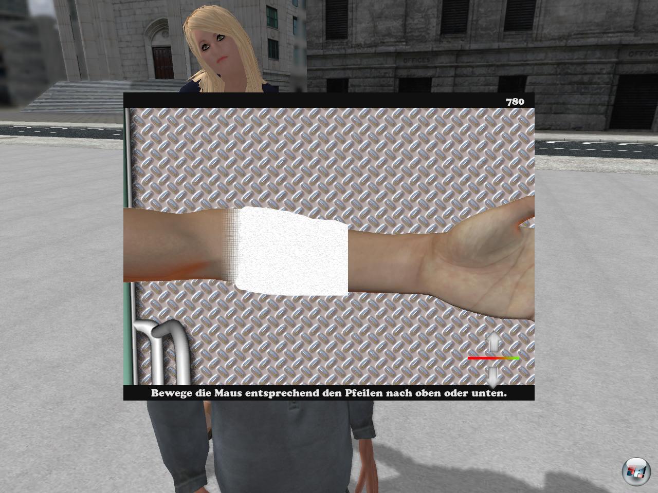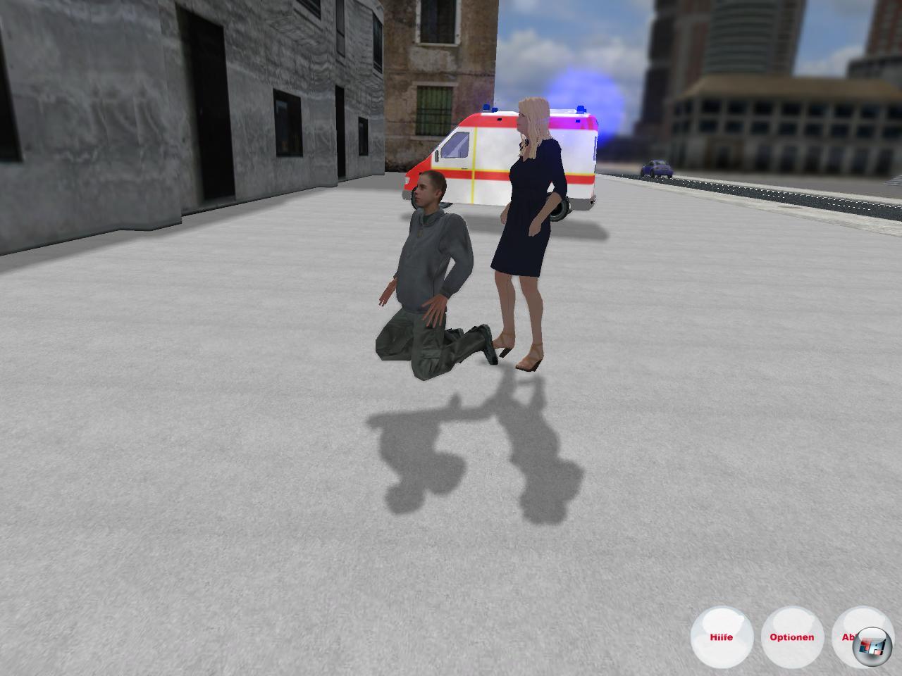 In Egosicht bewegt ihr euch vom Auto direkt zu dem oder den „Opfer(n)“, welche nicht deswegen so gruselig aussehen, weil sie verletzt wären, sondern weil sie offensichtlich direkt der Polygonhölle entflohen sind. So etwas habe ich noch nicht gesehen…und ich habe mittlerweile viel Furchtbares gesehen: Unförmige Gliedmaßen, schrecklich überlange Finger und diabolische Fratzen, per Bitmap auf die bedauernswerten Rümpfe geklatscht…gru-se-lig! Wenn ihr euch von dem Schock erholt habt, wird es immerhin etwas komisch…wenn auch unfreiwillig. Es folgen nämlich Minispiele aus der untersten Schublade der Videospielgeschichte: Da müssen in abstrusen und stupiden Tipporgien Buchstabenfolgen in pseudo-rhythmischem Takt gedrückt werden, was dem „Bedienen“ eines Beatmungsgerätes entsprechen soll. Da muss die Maus auf- und abbewegt werden, was das Anlegen eines Verbandes (!) simulieren soll. Hier wird aber nichts simuliert, nicht mal ansatzweise. ![]()