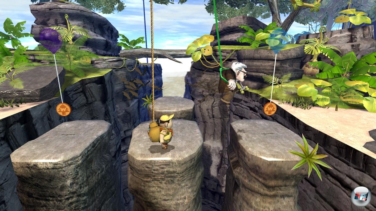 Die Asobo-Produktion für PC, PS2 und PSP macht es genau umgekehrt: Hier ist die Steuerung in nicht-invertierter Form Pflicht, was Anfängern zwar behagen dürfte, Profis aber fast zur Verzweiflung bringt – egal, ob im Doppeldecker-Cockpit oder als von Kevin getragener Lupenschütze. Ansonsten liefern die Franzosen aber wie schon bei Wall-E das überzeugendere Spielerlebnis ab. Der Vorsprung ist zwar nicht mehr so groß wie letztes Mal, bei den Flugeinlagen hinkt man dem amerikanischen Konkurrenzstudio sogar hinterher, aber in punkto Umfang, Abwechslung und Story-Telling hat man noch immer die Nase vorn. Doch auch wenn man auf dem Papier mehr als doppelt so viele Spielabschnitte aufweisen kann, ist die Spielzeit auch hier eher knapp bemessen und auch wenn es zusätzliche Aufgaben wie Floßfahrten, Verfolgungsjagden oder Balanceakte über stachelige Baumstämme gibt, mangelt es auf Dauer an spielerischer Abwechslung. Zudem ist die Steuerung mitunter etwas hakelig, Kamera und Kollisionsabfrage machen auch hier gelegentlich Zicken und die Story-Sequenzen am PC sehen aus wie abgefilmte PS2-Videos. Auch sonst ist die Grafik für PC-Verhältnisse eher unspektakulär.