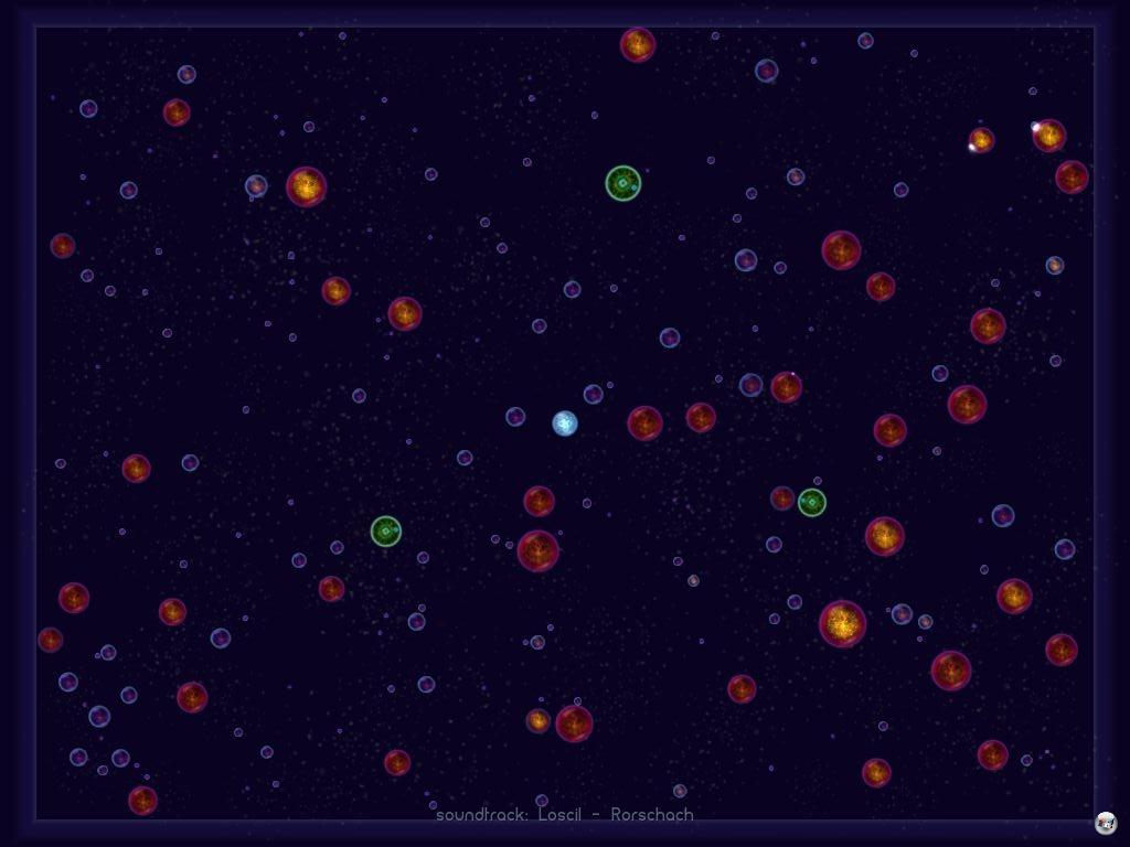 Aber man darf es nicht übertreiben, denn jede Bewegung kostet die eigene Kugel quasi Lebenskraft, symbolisiert durch den Verlust winziger Kügelchen, die wiederum Nahrung für Feinde darstellen. Davon gibt es einige mit unterschiedlichen Fähigkeiten, die das sofort ausnutzen: Die aggressiven KI-Kugeln wollen auch möglichst schnell wachsen. Und weil es nicht unbegrenzt Futter oder gar einen offenen Raum gibt, sollte man sich zuerst um diese Konkurrenten kümmern – sonst heißt es Game Over. Es gibt auch schwarzgrüne Antimaterie-Kugeln, die wie Parasiten an allem Größeren saugen oder flink flüchtende, die in der Nähe wie Magneten gleicher Polung abgestoßen werden.