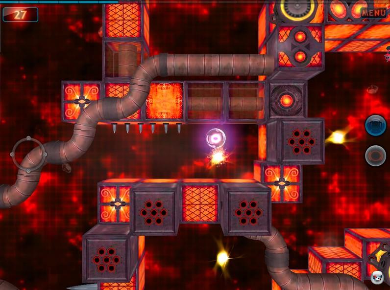 Trotzdem muss man sich stark konzentrieren, um wirklich präzise zu schweben oder genau zu schießen, denn die virtuelle Steuerung ist wesentlich empfindlicher und fehleranfälliger als ein Analogstick – vor allem der Einsatz der grünen Plasmaprojektile ist manchmal ein Glücksspiel. Zu Beginn flucht man noch, aber mit der Zeit kann man den richtigen Rhythmus finden, wenn man behutsam vorgeht. Man kann sich an die Flugbahn gewöhnen und über kleine Schübe selbst verzwickte Sackgassen und rotierende Fallen durchfliegen. Es ist allerdings ärgerlich, dass man die Steuerung nicht anpassen kann: Weder die Position oder Größe des Steuerkreises auf dem iPad noch seine Achsen oder Empfindlichkeit lassen sich modifizieren.
