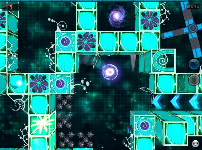 Man navigiert die schwebende Kugel über einen Steuerkreis am linken Rand: Sobald man ihn antippt, sorgt ein kleiner Luftstoß für einen Antrieb in genau die Richtung, die man mit der Fingerspitze berührt hat – hier sind theoretisch 360 Grad möglich. Das Knifflige an der Steuerung ist die eigene Verletzlichkeit und die Tatsache, dass man sein Tempo vor Hindernissen manchmal schnell drosseln muss; dafür gibt es eine Art Bremse am rechten Rand: Nur wer dieses rote Symbol gedrückt hält, sorgt für den sofortigen Stillstand – sie reagiert also nicht abrupt. Das blaue Symbol darüber sorgt wiederum dafür, dass die Kugel kleiner wird, denn damit lässt man Luft ab. Nur so kann man manchen schmalen Korridor überwinden. Je schneller man die Levels abschließt, desto höher ist die Punktzahl.