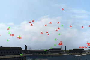 Zu guter Letzt könnt ihr selbst aktiv werden und Geschütztürme auf den Schiffen steuern (à la „Incoming“) oder euch in ein Flugzeug-Cockpit hocken. Hierbei steht Action klar im Vordergrund, gepaart mit einer Arcade-Flugphysik. Diese Idee ist eigentlich ganz nett, bringt euch aber keinerlei Vorteile. Ihr bekommt keinen Schadensbonus verpasst und den Ausgang der Schlacht könnt ihr sowieso nicht beeinflussen. Hierbei sowie in der taktischen Ansicht fällt jedoch auf, dass die Optik des Spiels längst nicht mehr zeitgemäß ist und vor allem die Schiff- und Flugzeug-Modelle grob wirken. Von weitem erkennt ihr von den Schiffen sowieso nur graue Klötze und beim Vorbeiflug werden Geschütze und wenige Aufbauten sichtbar, mehr nicht und Abwechslung schon gar nicht. Wesentlich schlimmer sieht es bei Gebäuden aus, die so schrecklich lieblos schon im Jahr 2000 existierten und von der im Hintergrund düdelnden „Musik“ bekommt man sowieso nur Kopfschmerzen.