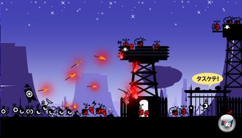 Hatte ich die Zigotons noch nicht erwähnt? Unsere Todfeinde? Dieses schwarz-rote Gesindel, das meine Patapons ins Exil verbannt hat? Fiese Mistkerle sind das, die geschickt mit Schwert, Speer und Bogen umgehen, die sich feige hinter Barrikaden verstecken und auf Wachtürmen Stellung beziehen. Da kann sich ihre Vorhut noch so gerissen hinter den wankenden Büschen der Papierkulisse verstecken – wenn wir ihre hervor guckenden „Hasenohren“ erspähen, schlagen wir zu! Wir schnappen uns die Zigotons, wir werden nach Erdende, ins Paradies der Patapons, marschieren, und wir werden ES finden. Fragt ein Patapon doch tatsächlich am Lagerfeuer, was ES ist. Lächerlich. ES ist… das werden wir schon sehen!