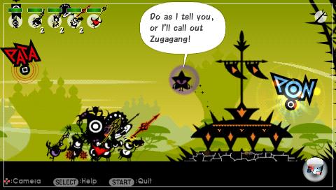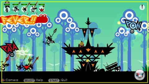 Für ein wenig Auflockerung könnten die jetzt viel wichtigeren Wunder sorgen? In der Theorie, ja. Doch die Wunder halten nur den Spielfluss auf: Denn sobald meine Patapons den dafür notwendigen Tanz aufs Parkett legen, finden sie sich auf einem anderen Bildschirm wieder, ahmen die zehn immer gleichen Rhythmen nach und müssen anschließend erst wieder ihr Fieber entwickeln. Wer das dreimal pro Mission macht, entwickelt bald eine Aversion gegen die Wundertrommeln. Oh, apropos Fieber: Der wichtige Bonus geht auch dann flöten, wenn… nun, wie ihr wisst, ist auch ein Gott gewissen irdischen Bedürfnissen erlegen. Na, jedenfalls kommt es reichlich ungelegen, dass Er den Vormarsch seiner Untertanen auch beim zweiten Feldzug nicht pausieren darf.