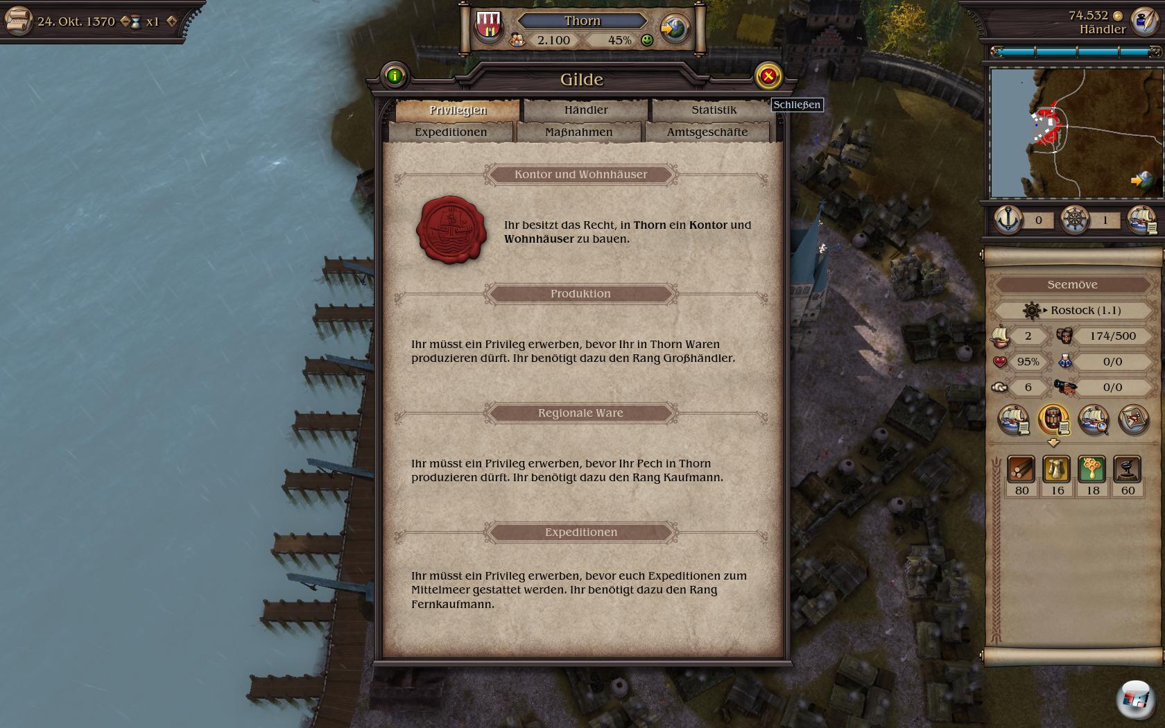 Alle 300 Städte, die jemals Mitglied der berühmten Handelsorganisation waren, kommen in Patrizier IV zwar nicht vor. Aber man kann die 32 wichtigsten Häfen von London über Bergen, Hamburg, Danzig bis Riga anlaufen. Die bedeutendste Hansestadt an der Ostsee war Lübeck, wo auch die einzige Kampagne des vierten Teils beginnt. Leider darf man nur im freien Spiel einen anderen Heimathafen wählen, denn Lübeck bietet eigentlich bis auf seine zentrale Lage zwischen den Meeren wenig. Es gibt zwar Salz, Nahrung und Bier, aber das so wichtige Holz für die Schiffsbauten muss man von weit her holen. Das heute polnische Thorn ist da schon besser dran, da es mitten im Wald liegt, Pech, Honig und Holz produziert und sogar ab und an Gewürze auftauchen.