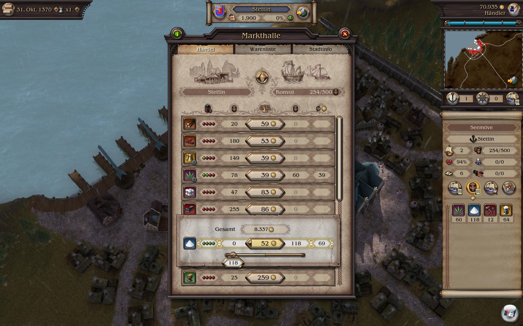 so dass man nicht mehr so lange braucht, bis sich der Geldbeutel spannt. Zwar gibt es immer noch dieselben Waren und Handelsstädte wie beim Vorgänger, aber selbst kürzere Fahrten lassen die Kasse klingeln. Man kann zwar immer noch Felle von Nowgorod nach Hamburg fahren, was auch viel einbringt. Meist reicht es aber, wenn man sich anschaut, was eine Stadt produziert und was sie benötigt. So fehlt in London fast immer Wolle, in Lübeck Holz und in Stockholm wird viel Bier getrunken. Auf der anderen Seite wollen alle Salz, Met und Korn, so dass man einträgliche Routen planen kann. Wem das ewige Hin und her zu mühsam ist, der kann seine Schiffe auch automatisch fahren lassen, was allerdings ein wenig komplex zum Einstellen ist.