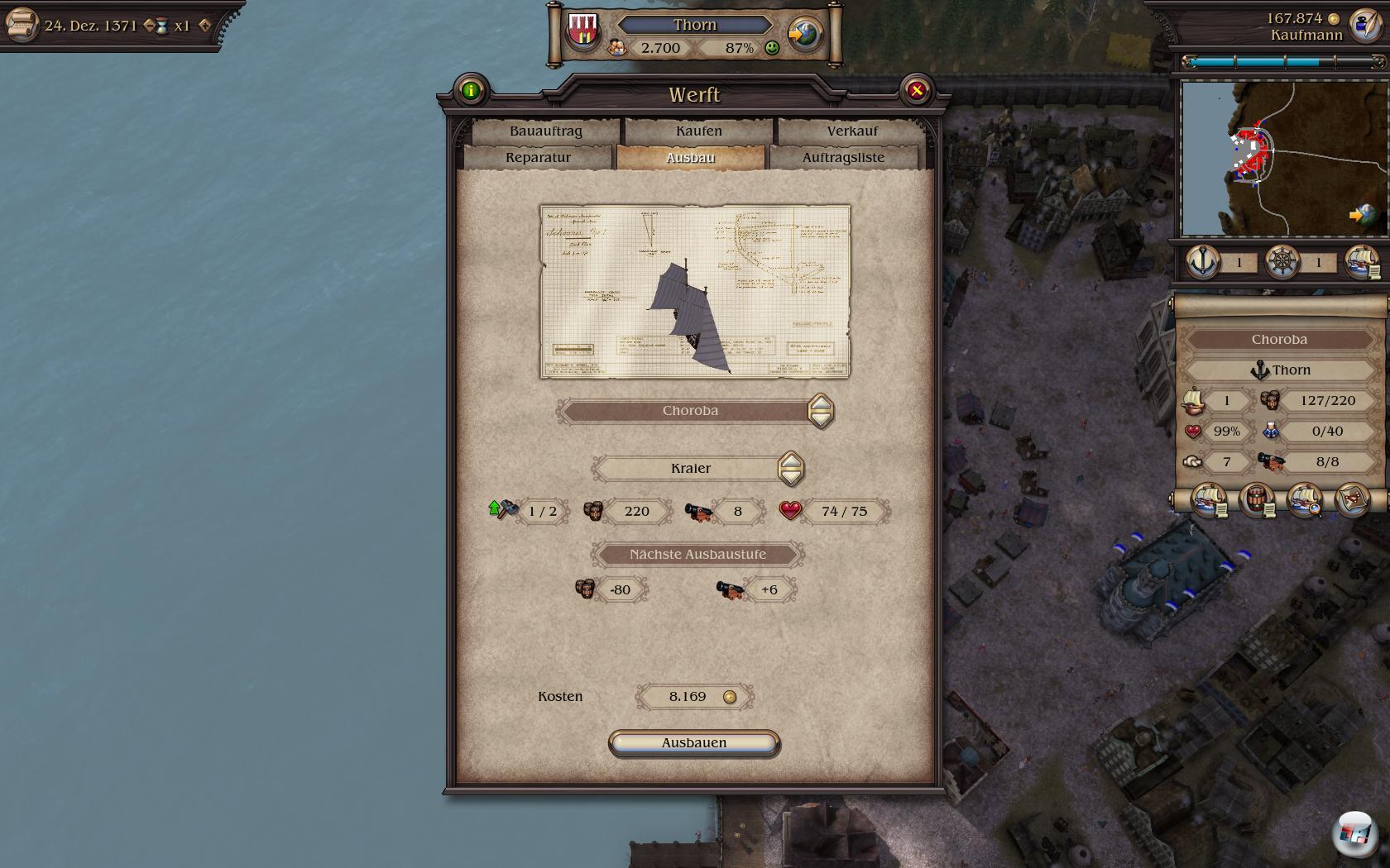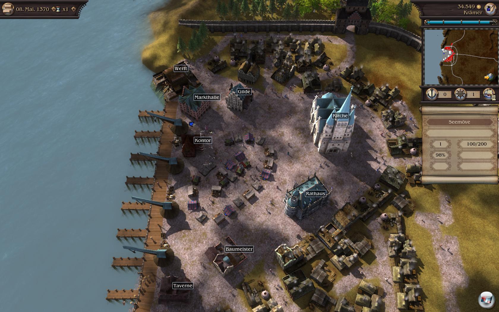 Der persönliche Aufstieg bringt trotz der wenig präsenten Konkurrenz Spaß, auch weil der Ausbau der Städte interessant ist. Auch hier gilt eine strenge Reihenfolge, denn zu Beginn darf man nur die einfachen Gebäude bauen wie Bauernhöfe, Lagererweiterung oder Wohnhäuser. Später dann auch ne Brauerei, wenn man die entsprechende Lizenz der Gilde bekommt. Wer irgendwann Bürgermeister wird, darf auch was für die Stadt tun, denn darf er ein besseres Dock für größere Schiffe, eine Kirche oder gar eine Universität bauen, was für zusätzliche Motivation sorgt. Daneben gibt es auch Schutzbauten wie Mauern, die dem gierigen Landesherren eine Belagerung erschweren. Leider ist es mit dem Scrollen in der Bauansicht vorbei, denn sie hängt, wenn man nach rechts strebt: So muss man über die Minikarte den Ort wählen, anstatt bequem direkt dorthin zu kommen.