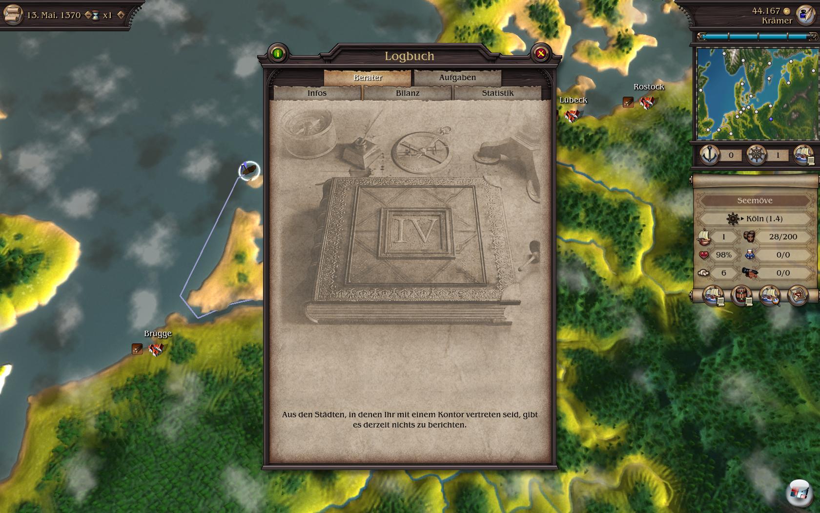 denn man muss es bisweilen verbessern, um ein Ziel zu erreichen. Überhaupt sind die Ziele ganz unterschiedlicher Natur: Mal muss man eine Summe Geld scheffeln, ein Gebäude bauen oder seine Flotte erweitern. Bisweilen muss auch nur eine automatische Route einrichten, um weiter zu klommen. Das erinnert eher an ein Tutorial und ist selbst auf dem schweren der drei Schwierigkeitsgrade zu einfach. Es gibt aber auch Quests, wo man etwa zum Fernkaufmann aufsteigen muss, was schon einige Zeit dauern kann. Allerdings muss man selten richtig grübeln oder über wirtschaftliche Strategien brüten – das bleibt die Ausnahme: So soll man in einer anderen Stadt ein Kontor errichten, wofür man ein bestimmtes Ansehen innerhalb der Gilde erreichen muss. Wie soll das gehen, wenn man nix bauen kann?
