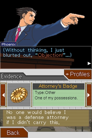 Veteranen, die den Vorgänger Phoenix Wright: Ace Attorney <a class="DYNLINK" onmouseover="DynToolTipp_Show('Klicken für Gameinfos‚)“ onmouseout=“DynToolTipp_Hide(); “ href=“javascript:DynCont_Display(‚Gamefinder‘,’runmod.php?sid=%7BSID%7D&LAYOUT=dyncont_gf&spielid=7669′)“> kennen, wird der erste von vier Fällen vielleicht ermüden, aber diese Art Tutorial ist kreativ mit der Story verknüpft, denn eine Zwischensequenz zeigt einen Bösewicht, der mit einem Feuerlöscher auf euch einschlägt. Wer war das? Und warum hat er das getan? Die Neugier ist geweckt und der Polizistenmord harrt der Aufklärung. Die Beweisfindung ist zunächst sehr einfach – ein wenig Gehirnschmalz hier und logisches Verständnis da, dann ist die Lücke in der Anklage gefunden.