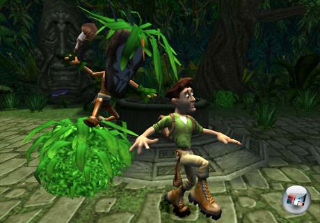 Auch die Kampfsteuerung wirkt wenig durchdacht: Welchen Schlag oder Tritt Harry vom Stapel lässt, entscheidet grundsätzlich der Zufallsgenerator. Immerhin sorgen erlernbare Angriffe und Waffen wie eine Schleuder für Abwechslung. Ärger verursacht auch die Kamera: Die dreht sich regelmäßig in kniffligen Sprungsequenzen an die falsche Stelle. Ein weiteres Manko ist die steinzeitliche Grafik: Ganz so schlicht wie in den Achtzigern schaut der Dschungel nicht aus – eher wie in den Neunzigern. Manch ein zehn Jahre altes Spiel bietet also mehr Details und schärfere Texturen als das, was Entwickler Edge of Reality hier abliefert. In einer Höhle habe ich eine geschlagene Minute gebraucht, bis ich erkannte, dass der unförmige Polygonklumpen vor mir ein Flugzeug-Cockpit darstellen sollte. Erst dann dämmerte mir, dass ich mich auf die Spitze des Objekts schwingen musste, damit Harry durch eine Nische klettert.