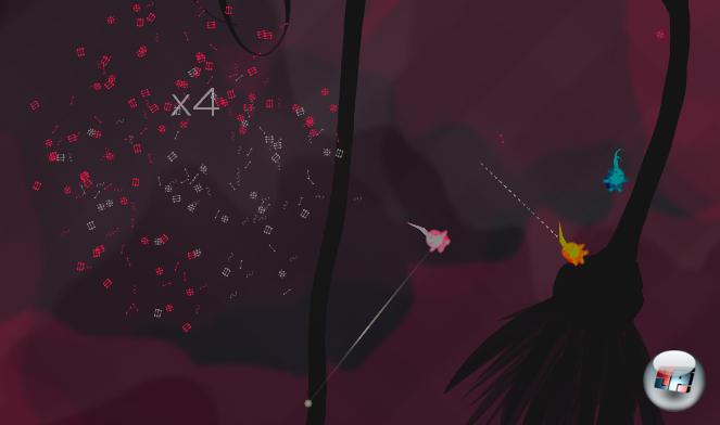 Der Trip in den Neongarten steuert sich ähnlich wie das Rope Race in Worms – nur andersherum. Während des Fluges könnt ihr kein rettendes Seil abschießen. Statt dessen müsst ihr bereits vor dem Absprung kalkulieren, wohin die Reise geht. Drückt ihr den Sprungknopf einmal, bleibt ihr an einem seidenen Faden hängen. An diesem schwingt ihr euch mittels Analogstick ein paar Runden durch die Gegend , bevor er zerreißt oder ihr ihn mit einem zweiten Knopfdruck kappt. Ihr könnt natürlich auch gleich zweimal auf den Sprungknopf tippen, um ganz klassisch ohne Seil durch die Flora zu hüpfen. Effektiv bewegt ihr euch aber nur voran, wenn ihr euch schwungvoll durch die Gärten hangelt und jede Menge Pollen einkassiert. Lasst euch nicht von der zu Beginn etwas ungewohnten Handhabung einschüchtern: Nach einiger Zeit gleitet ihr so elegant durch die Nacht wie Spiderman. Auch die zu Beginn oft bedrohlich leere Zeitleiste wird schon bald zu einem geringeren Problem: Erwischt ihr eine Kombo aus fünf oder mehr Pollen, erscheint kurz darauf ein Ring aus kleinen Zeit-Extras.