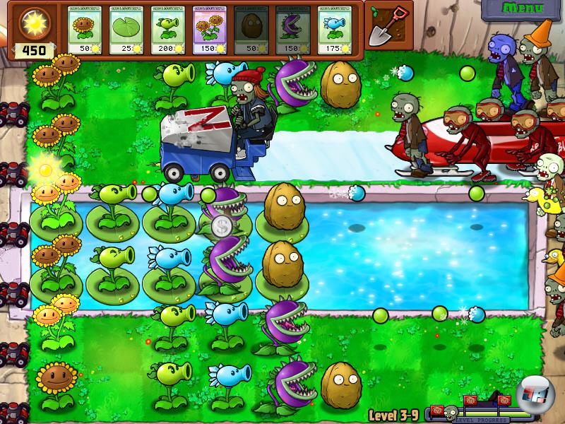 Wer schon mal ein Tower Defense-Game gespielt hat, weiß im Großen und Ganzen, worum es bei Plants vs. Zombies (PvZ) geht: Von rechts rücken die Armeen der Finsternis wankend und stöhnend in Wellen heran, links werden die wackeren Verteidiger der Hirne gepflanzt. Anfangs beschränkt sich der Killergewächsekader auf einfache Erbsenspucker, die den Standard-Zombie schnell aus den zerlöcherten Latschen hauen. Schon nach kurzer Zeit gesellen sich weitaus anspruchsvollere Massenzerpflanzungswaffen hinzu: Kirschbomben sprengen ganze Zombie-Reihen auf einmal weg, Fleischfresser verschlingen einen Untoten (sind danach aber eine Weile mit Kauen beschäftigt), Kakteen holen an Ballons schwebende Untote vom Himmel , eine Kohlschleuder schleudert Kohl, ein Mais-Katapult unbehandeltes Popcorn und Butter, das die Zombies kurzzeitig stoppt. Dazu kommen noch passive Verteidigungsmittel wie die Wall-Nuss, die in zwei Stärken vorkommt und das Anrücken der Feinde kurzzeitig aufhält.