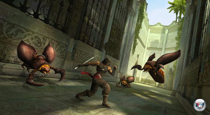 Wieso fliegt der Prinz z.B. so künstlich durch die Luft? Er scheint auf den letzten Zentimetern fast etwas nachzuziehen und sein Gewicht scheint keine Rolle zu spielen. Warum steht er starr wie ein Profiturner auf Balken in zehn Meter Höhe? Er rollt zwar elegant und zieht seinen Säbel ansehnlich, aber weshalb wirken die Monster in ihrem Auftreten bloß so unspektakulär? Was einem in Kratos‘ Abenteuer schon in den ersten Sekunden Ehrfurcht einflößt, weil die Feindseligkeit und Kraft der Kreaturen mit jedem Polygon und Muskel aus dem Bildschirm trieft, sorgt hier eher für: Och, ein paar weich gezeichnete Skelette? Mal eben platt machen.