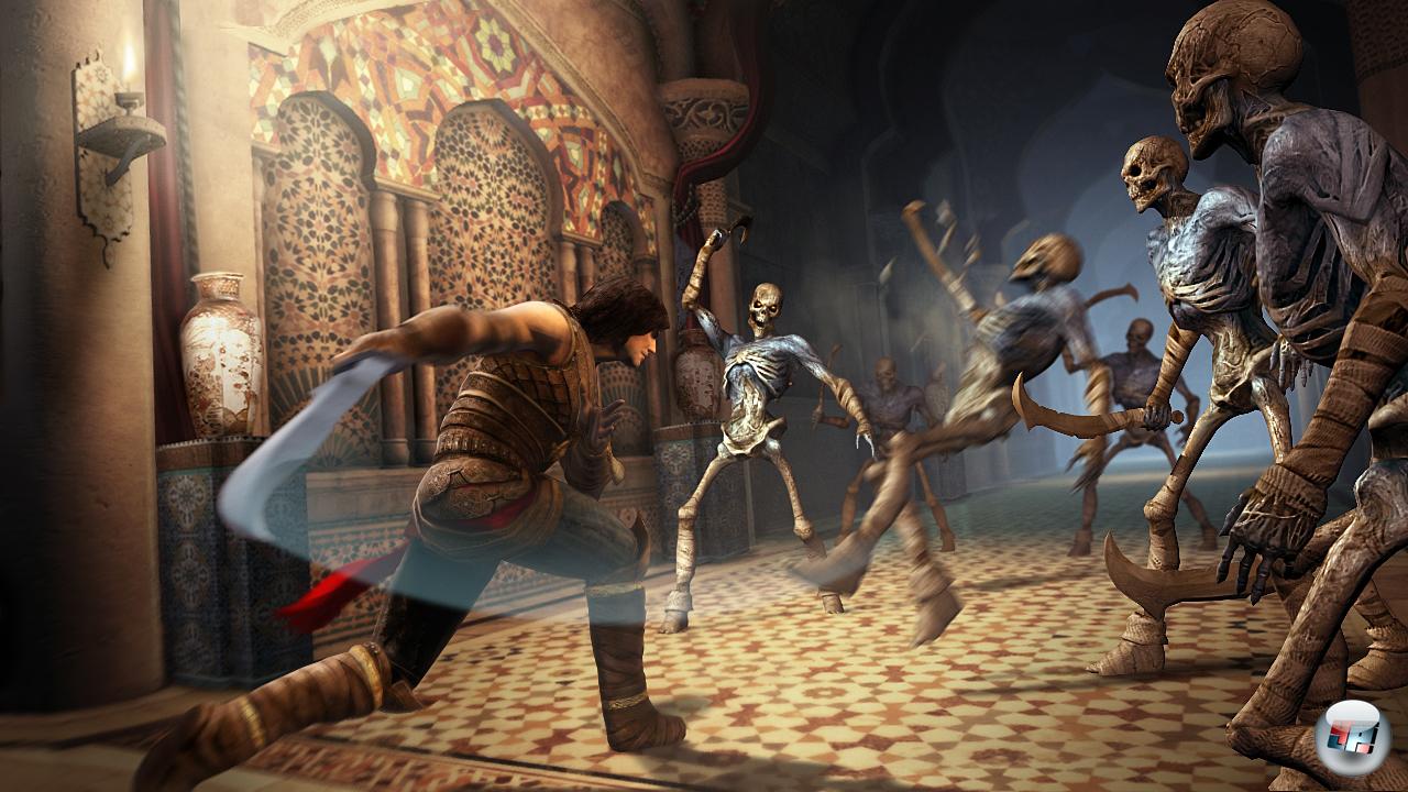Hinzu kommen Wind und Sand auf Wii: Der Prinz kann nicht nur einen Wirbel an bestimmten Punkten entstehen lassen, der ihn höher trägt und in luftiger Höhe weiter springen lässt, sondern auch eine magische Sphäre entstehen lassen, die ihn entweder kurz im Kampf schützt oder die er als schwebende Plattform für weitere Sprünge nutzen kann. All das sorgt für mehr Freiheit und Spielerei während der Kletterphasen, denn man kann innerhalb der Abschnitte nicht nur das gewöhnliche Springen, Ausweichen und Klettern nutzen, sondern auch experimentieren. Und das sogar zu zweit: Auf Wii kann sich ein Spieler eine Remote schnappen und nicht nur Vasen zerdeppern oder Hinweise in die Kulisse malen, sondern auch Fallen oder Feinde kurzfristig verlangsamen und die Spezialkräfte des Prinzen auslösen – das macht kooperativ richtig Laune und geht weit über das hinaus, was Super Mario Galaxy für zwei Hüpfer in petto hatte.