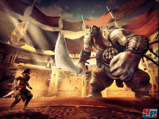 dass bis auf ein paar neue Bewegungen alles irgendwie vorher schon mal da war – und das teilweise sogar besser, denn einige Bewegungen, wie z.B. der Schwungangriff an einem Pfosten oder die Zeitlupeneinstellungen bei manchen Angriffen, sahen im Vorgänger besser aus. Einzig die Sequenz mit dem Streitwagen ist eine echte Neuerung, doch ist diese vor allem steuerungstechnisch weniger gelungen. Da kann der erste dicke Zwischenkampf im Stil von David gegen Goliath eher beeindrucken, doch hat Ubisoft die Quick Time Reaction-Spielchen trotz der opulenten Umsetzung fleißig von Sonys God of War kopiert.