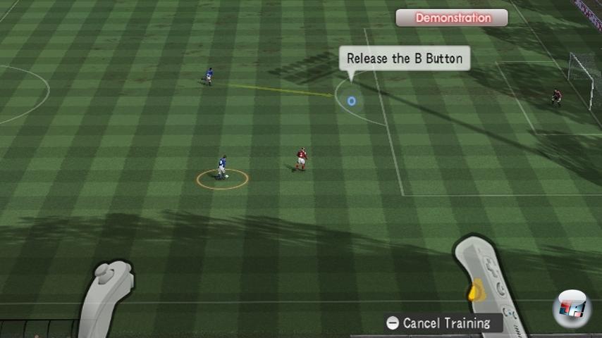 oder flach, links oder rechts geschossen wird. Aber in der Praxis war davon selten etwas zu spüren und warum gibt es dann kein Training dafür? Man kann zwar wunderbar in die Laufrichtung schießen, und den Ball sogar am Torwart vorbei ins Netz legen, aber Schussrichtungswechsel im Lauf waren knifflig. Außerdem verzieht man das Nunchuk schon mal in der Hektik des Strafraums. Natürlich wird dann trotzdem auf das Tor gefeuert, da nur die Werte des Spielers entscheidend sind. Aber damit ist die manuelle Präzision im Abschluss noch ein Schwachpunkt, denn so kommen die Strafraumszenen letztlich nicht an den Nervenkitzel des großen Vorbilds heran. Ausgeglichen wird das jedoch durch das freiere Kopfballspiel: Man kann wunderbare Flanken in den Strafraum ziehen und dann wird schon mal mit einer Kopfballbombe oder einem Volley abgeschlossen – wenn die Dinger sitzen, kommt Freude auf!