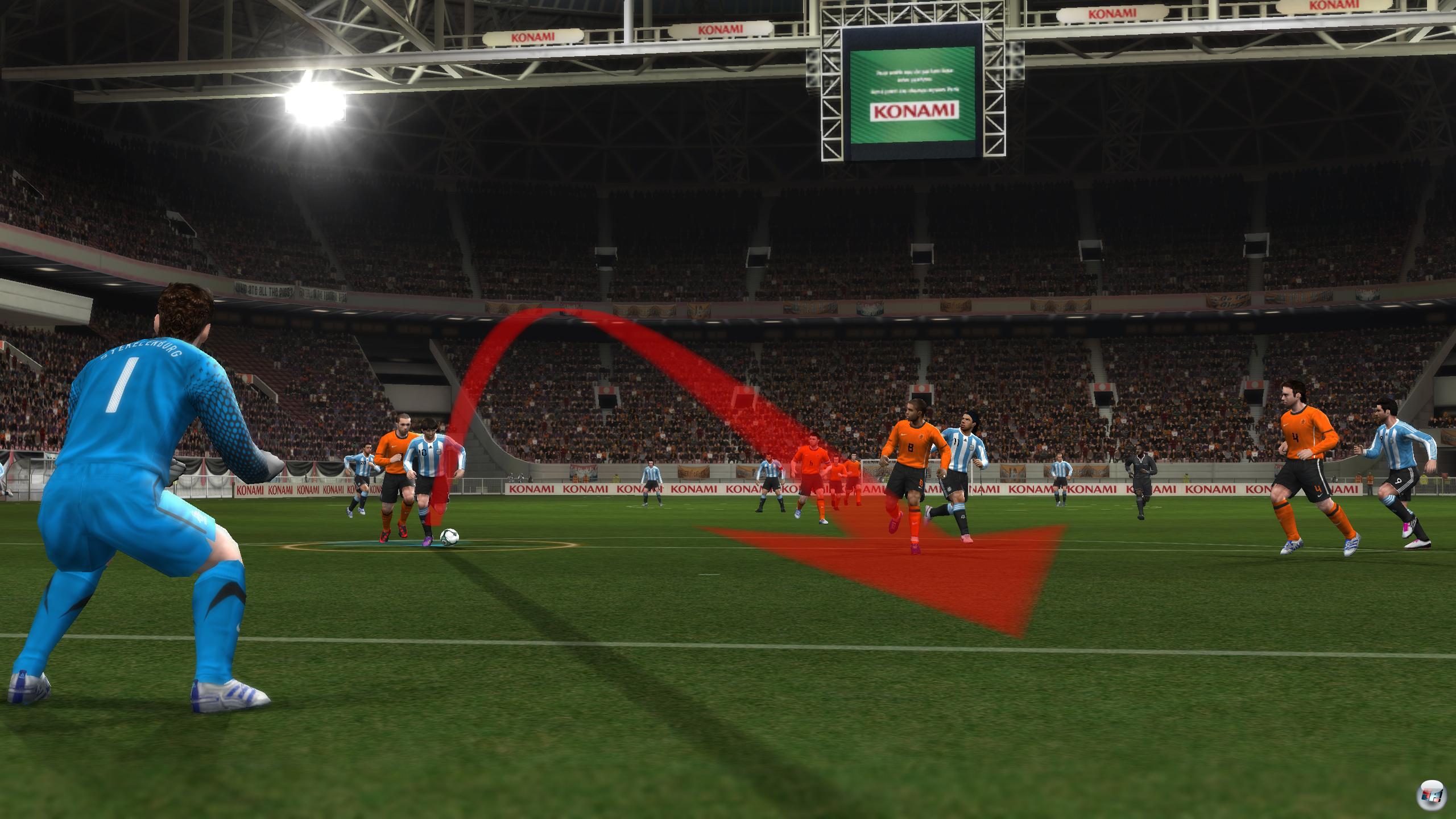 Natürlich liegt der Schwerpunkt hier auf der großen Strategie, aber in diesem zentralen Bereich der Pfeilmalerei auf dem Feld gibt es gegenüber der Premiere aus dem Jahr 2008 kaum Entwicklungen – und das ist Segen und Fluch zugleich. Man nutzt immer noch das intelligente und motivierende Grundprinzip, wenn man seine Laufwege direkt per Remote auf den Platz malt. Man kann nicht nur dem Ball führenden, sondern auch jedem anderen Spieler direkt Bewegungsanweisungen mit einem Ziel geben – in der Abwehr, im Angriff als auch bei Standards, wo man seine Stürmer schnell mit ein paar Pfeilen in den Strafraum schickt, bevor man das Leder gen Torwart schlenzt. Ist man in Tornähe, kann man immer noch entweder das Nunchuk für einen automatischen Schuss schütteln oder versuchen die Richtung zu bestimmen, indem man mit der Remote auf die betreffende Stelle des Tores zeigt und B drückt – wie gehabt mit allen Fehlern hinsichtlich der Genauigkeit, denn der Ball landet nicht immer da, wo man ihn haben wollte.