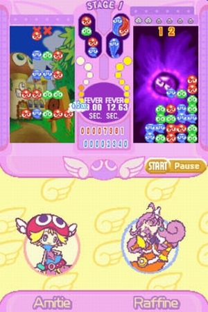 Du und dein Puyo Das Spielprinzip von Puyo Pop Fever lässt sich am besten als eine Mischung aus Tetris und dem Mega Drive-Klassiker »Dr. Robotnik’s Mean Bean Machine« beschreiben: Von oben fallen in regelmäßigen Abständen die glibbrigen, mehrfarbigen und in mehreren Größen auftretenden Puyos ins Spielfeld. Stapelt man vier oder mehr gleichfarbige neben- oder übereinander, lösen sie sich in Wohlgefallen auf. Vermasselt ihr das kluge Stapeln, ist schnell der obere Rand erreicht und damit das Spiel vorbei. Ihr könnt entweder gegen Computergegner, euch selbst oder die Zeit zocken, die Spielmodi bieten euch mehr als genug Wahlmöglichkeiten: In der Story-Variante erwarten euch unterschiedlich schwere Bahnen und immer cleverer agierende KI-Widersacher, dazu gibt es noch den freien Kampf. Außerdem lauert noch der Endlos-Modus, in dem ihr Aufgaben bewältigen oder ohne feste Ziel Puyos stapeln müsst, bis der Arzt kommt bzw. der DS-Akku den Geist aufgibt. Achtfachstapler Der Mehrspielermodus des vom Sonic Team entwickelten Games bietet Platz für bis zu acht Spieler, wobei nur ein Modul benötigt wird – hat jeder eins, gibt’s weniger Wartezeit und eine vollständige Präsentation, aber auch so sind alle Spielmodi vorhanden. Optisch ist das Spiel einem ungeschrieben Puzzlegame-Gesetz folgend sehr schlicht: niedliche Puyo-Animationen gesellen sich zu japanisch-bizarr designten Figuren, dazu gibt es fröhliche Tüdeladü-Musik und ein wenig englische, leicht nervende Sprachausgabe. Der einzige Unterschied zur bereits seit einiger Zeit erhältlichen GBA-Fassung ist das etwas schärfere Bild – sowie die sich während eures Spiels auf dem unteren Bildschirm balgenden Kontrahenten. Außerdem könnt ihr die Puyos auch per Stylus bewegen und drehen – aber warum sollte man das tun? Mit dem Digipad geht’s weitaus schneller und präziser. |  | Fakten: – 16 Charaktere – Acht-Spieler-Modus – es wird nur ein Modul benötigt – vielerlei Spielmodi – fünf Schwierigkeitsgrade – automatisches Speichersystem – optionale Touchpadsteuerung Pro / Kontra: + einfache Steuerung + fesselndes Spielprinzip + spaßiger Mehrspielermodus mit nur einem Modul + sanft steigender Schwierigkeitsgrad – zweckmäßige Optik – durchschnittliche Akustik – nervige Sprachausgabe – antiquiertes Spielprinzip – leicht sinnlose Touchpad-Implementierung  | | Der Touchscreen dient in erster Linie der Portraitdarstellung. |