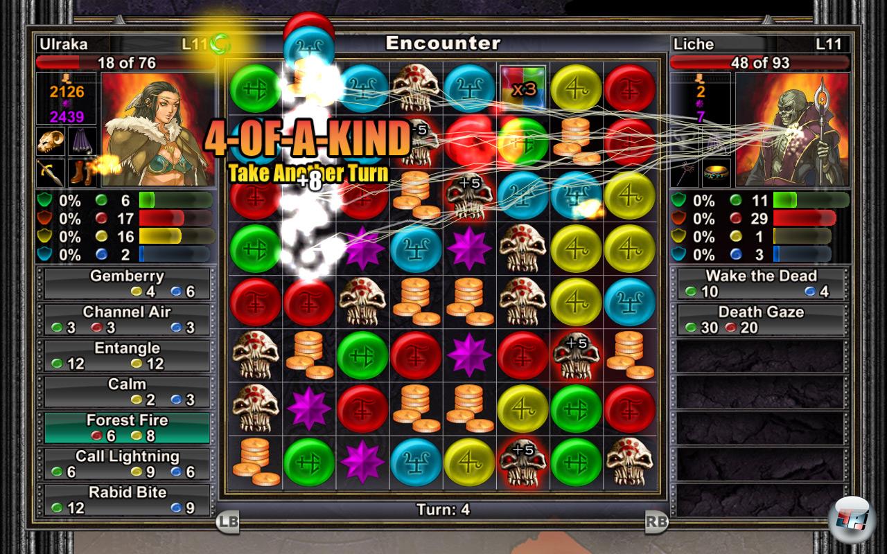 tausendste Klon eines Denkspiels. Hat man erst einmal Zeit damit verbracht, scheint es vielmehr, als wäre das Genre der Puzzler nur ein Skelett, eine Tech-Demo – das Gegenstück zu einer Ego-Shooter-Studie, mit der man in einem weißen Raum auf bunte Zielkreise schießt. Denn so sehr das Kombinieren der acht Teile auch im Vordergrund steht: Worum es in Puzzle Quest geht, steht im zweiten Teil des Namens. Denn die Australier haben nicht weniger getan, als ein ausgewachsenes Rollenspiel zu entwickeln! Und das Puzzeln ist ihr Kampfsystem – und zwar ein enorm umfangreiches.