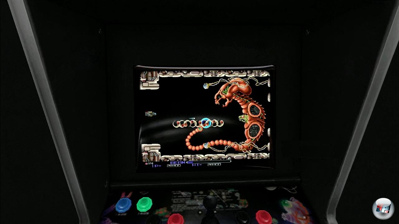 RTD entspricht den Spielhallen-Versionen der Spiele, und bietet damit das vollständige R-Lebnis – anders als die teilweise gekürzten Heimcomputer- und Konsolen-Versionen. Fummelt ihr in den Grafikoptionen herum und stellt die Darstellung auf »2D«, ist sogar die Präsentation ganz wie in der Spielhalle. Die Sonderoption »Arcade« treibt diese Parallele sogar insofern auf die Spitze, als dass ihr aus einiger Entfernung auf den Original R-Type-Automaten blickt und das Game von »außen« spielt – inkl. Joystick-Gerüttel, Kopfbewegungen und Spiegelungen auf der Glasoberfläche des virtuellen Bildschirms! Ein Druck auf die Y-Taste hingegen transportiert euch in einem eleganten Übergang ins Jahr 2009: Aus blockigen Pixeln werden schattierte Polygone, aus Bitmap-Explosionen fauchende Lichterwellen, aus dreistufigen Animationen weiche Echtzeit-Bewegungen. Zuviel des Guten? Y-Taste, und alles ist wieder wie vor 20 Jahren. Oder wie wäre es mit einem Kompromiss? Man kann die moderne Grafik künstlich verpixeln oder die Farbpalette auf 8 Bit runterrechnen lassen – die Möglichkeiten sind faszinierend und variantenreich. Ganz bizarr wird’s mit der 3D-Option »Verrückt«: Dann wird die Grafik nämlich um ein paar Grad in den Raum gekippt – das macht aus RTD jetzt keinen Ego-Shooter, das Spielprinzip findet auch aus dieser Perspektive wie gewohnt auf zwei Ebenen statt. Aber es sieht teuflisch cool aus. Diese Übergänge sind jederzeit möglich und wunderbar flüssig, so dass sie sich nicht negativ auf den Spielverlauf auswirken – eine tolle und noch toller umgesetzte Idee! Allerdings gibt es aus moderner Sicht doch Mecker-Potenzial: Der 16:9-Modus füllt nicht den gesamten Bildschirm aus, links und rechts bleiben in jedem Fall dünne dunkle Streifen. Außerdem ist ärgerlich, dass das Layout der Feuerknöpfe nicht veränderbar ist.