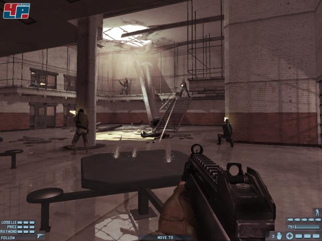 Während die KI auf dem enttäuschenden Level stagniert und bei den Teamkameraden sogar einen Rückschritt darstellt, hat sich verglichen mit den Konsolenfassungen allerdings auch einiges verbessert: Den größten Schritt nach vorne hat eindeutig die Grafik gemacht, die ohne nervige Slowdowns mit herrlich detaillierten Texturen, feinen Partikel- und Lichteffekten sowie einer neuen Physikengine protzt und damit PS2 & Co deutlich hinter sich lässt. Zwar wirken einige Animationen manchmal etwas steif und die Umgebung lässt sich bei weitem nicht so demolieren wie z.B. in Black, doch ist Lockdown ohne Zweifel ein ansehnlicher Titel, der auch akustisch mit krachendem Surround-Sound überzeugen kann. Eine weitere positive Veränderung wurde bei der Teamausrüstung vollzogen: Hier könnt ihr nicht nur wie gehabt eure Mannschaft nach Belieben mit Uniformen, Ballermännern und Granaten ausstatten, sondern habt neuerdings auch die Möglichkeit, Primär- und Sekundärwaffen wie unterschiedliche Gewehre und Pistolen mit jeweils einem Spezialgegenstand aufzuwerten. Diese umfassen z.B. ein Zielfernrohr, Schalldämpfer, größere Magazine oder ein rotes Laservisier zur besseren Zielerfassung. Die Spielabschnitte entsprechen erweiterten Karten der Konsolenversionen, wobei die Reihenfolge für den PC etwas verändert wurde. Seid ihr zu einer Geiselrettung unterwegs, reicht es mittlerweile nicht mehr, diese nur in den spartanisch eingerichteten Gebäuden zu finden. Auf dem PC müsst ihr die Befreiten auch sicher bis zur Evakuierungszone beleiten und gebt dabei nicht nur euren Teamkameraden, sondern auch den Geiseln entsprechende Verhaltensanweisungen. Zwar kennt man dieses Element bereits aus anderen Teilen der Serie, doch stellen diese Abschnitte auf dem PC eine kleine, wenn auch nicht ungewöhnliche Bereicherung dar. Auch der neue Bewegungsmelder, den ihr genau wie die überarbeitete Nachtsicht auf