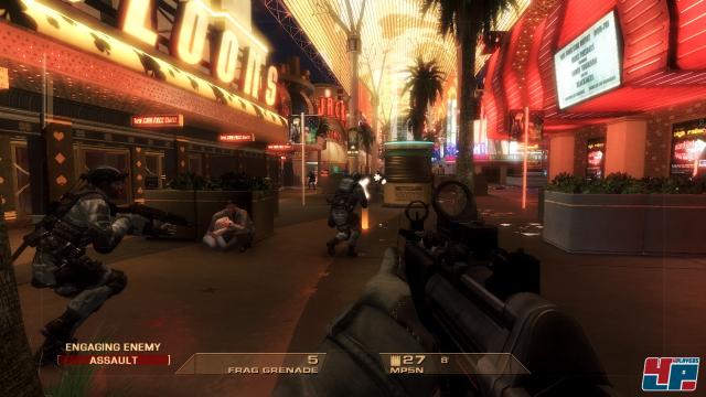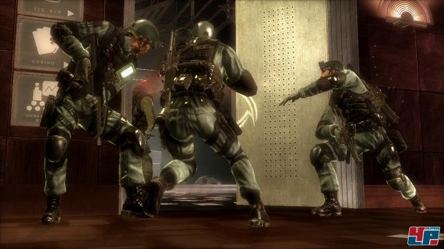 damit sich eure Kameraden sicher zur nächsten Deckungsmöglichkeit vorpirschen können. Besonders cool sind solche Momente, in denen ihr kopfüber an einem Seil hängt und die Gegner durch das Fenster hindurch mit gezielten Schüssen erledigt. Auch die Schießereien in den großen Casino-Hallen haben es in sich, wenn ihr zwischen all den blinkenden und schräg tönenden Automaten die Gegner sucht.Zu Befehl!