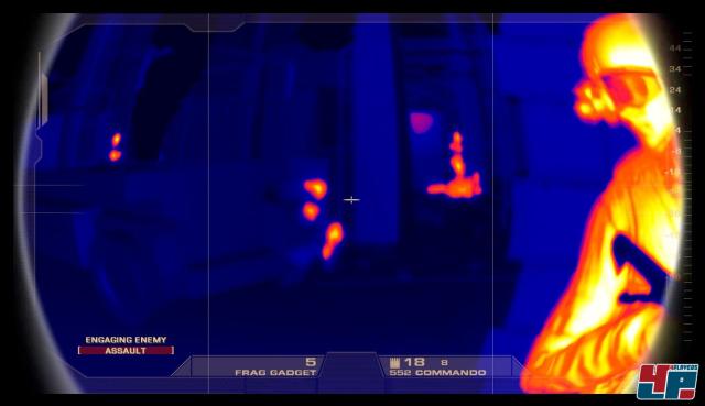 Das Sortiment ist mit authentischen Maschinenpistolen, Sturm-, Scharfschützen und Maschinengewehren sowie Pistolen und Shotguns sehr umfangreich ausgefallen, so dass ihr für jede Bedrohung die passende Antwort parat haben solltet. In der Kampagne dürft ihr neben der Pistole zwei schwerere Waffen eurer Wahl sowie Rauch-, Blend-, oder Splittergranaten mitnehmen. Doch damit nicht genug: Die meisten Ballermänner stattet ihr zusätzlich noch mit weiteren Extras wie Schalldämpfer, einem größeren Magazin oder diversen Zielfernrohren sowie einer Laser-Erfassung aus. Bisher war es fast schon die Regel, dass ihr die Waffen getöteter Feinde aus unerfindlichen Gründen nicht aufnehmen und selbst verwenden durftet. Bei R6 Vegas greift diese Regel zum Glück nicht und so könnt ihr nicht nur die Munition eurer Gegner aufnehmen, sondern auch deren Waffen. Doch mit Gewalt allein kommt ihr nicht immer zum Ziel. Neben der Snake Cam verfügt ihr über zwei weitere wichtige Utensilien, auf die auch Sam Fisher schwört: das Nachtsicht- und Wärmebildgerät. Letzteres ist vor allem dann sinnvoll, wenn euch die Gegner mit Rauchgranaten eingenebelt haben. Einfach auf’s Wärmebild umschalten und schon habt ihr den vollen Durchblick. Beim Nachtsichtgerät gestaltet es sich etwas schwieriger, da hier helle Lichtquellen das Gerät negativ beeinflussen. Der Kritikpunkt an der Previewfassung wurde leider nicht verbessert, so dass ihr auch bei der Vollversion manchmal den Eindruck habt, als würden die Sichtgeräte eurer Gegner besser funktionieren, wenn sie euch schon gezielt unter Beschuss nehmen, bevor ihr sie irgendwo ausmachen könnt.