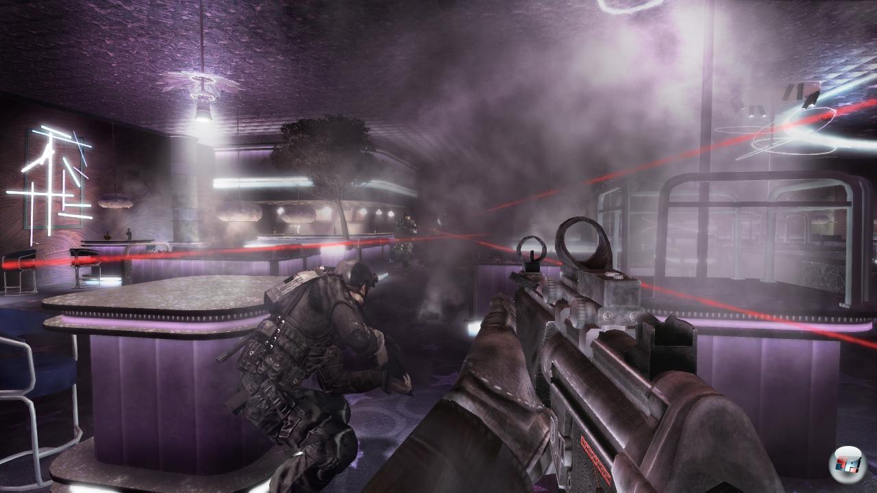 Inhaltlich erkennt man auf dem PC zunächst keine großen Unterschiede zur ungeschnittenen Konsolenfassung: Auch hier bekommt ihr eine üppige Ausrüstung mit zig Gewehren, Pistolen, Granaten sowie Schutzpanzern und kämpft euch u.a. durch Nachtclubs und Teile des Convention Centers von Sin City. Dabei sehen die Kulissen dank Vollbild-Kantenglättung und zuschaltbarer vertikaler Synchronisation merklich besser aus als auf der 360 – entsprechende Hardware vorausgesetzt. Auch kommt es hier nicht zu den massiven Slowdowns wie auf der Microsoft-Konsole, so dass der PC technisch gesehen eindeutig die Nase vorne hat; abgesehen von vereinzelten Soundaussetzern in den Funkdialogen. Allerdings leidet die KI auch hier an einigen reproduzierbaren Aussetzern, bei denen man nur mit dem Kopf schütteln kann, wenn die Kameraden den Weg nicht finden, in der Schusslinie stehen bleiben oder Gegner auf einer Treppe festhängen. Dafür dürfen sich PCler auf eine präzise Maus-/Tastatursteuerung freuen, wobei auch der 360-Controller problemlos erkannt wird. Gerade mit Letzterem ist das Spielgefühl mit dem flotten Deckungssystem und packenden Schusswechseln identisch zum Konsolenvorbild. Unterschiede zur ungeschnittenen Version erkennt man am Anfang kaum, denn selbst der rote Lebenssaft spritzt noch aus den getroffenen Körpern von Freunden und Feinden. Sind die Einschnitte, die Ubisoft für die USK-Einstufung vornehmen musste, vielleicht doch nicht so gravierend ausgefallen? Aber Moment mal: Ich bekomme zwar nach wie vor Erfahrungspunkte für Abschüsse, aber es wird nicht mehr präzisiert, für welche Aktionen ich überhaupt belohnt werde. In der Importfassung wurde z.B.