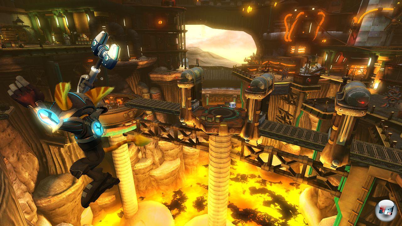 Aber Action ist nicht alles: Ratchet kann nicht nur mit seinem Schraubenschlüssel an Apparaten drehen, sondern auch Plattformen, Schalter und Hebel aus der Distanz anvisieren, um sie mit seinem Laserlasso zu bedienen. Außerdem schwingt er sich so über Abgründe, gleitet Funken sprühend über Schienen oder rast nach einem kurzen Druck aufs Steuerkreuz mit seinen Hover-Stiefeln inklusive Boost über Rampen – er kann sich auch wie in einem Flipper von Plattform zu Plattform schießen lassen oder mächtige Schleudern nutzen. Der Anteil an Jump’n Run hat zugenommen und das tut dem Spiel gut. Obwohl man nie so gefordert wird wie in den späten Phasen von Mario Galaxy, gibt es doch viele Abschnitte, wo angesichts schwebender Plattformen, stampfender Decken oder feuriger Ausbrüche punktgenaues Springen und Ausweichen verlangt wird oder die Uhr bedrohlich tickt – sehr schön.