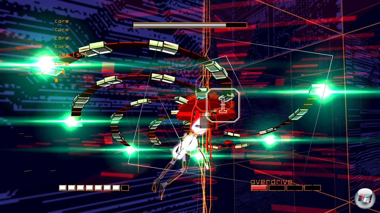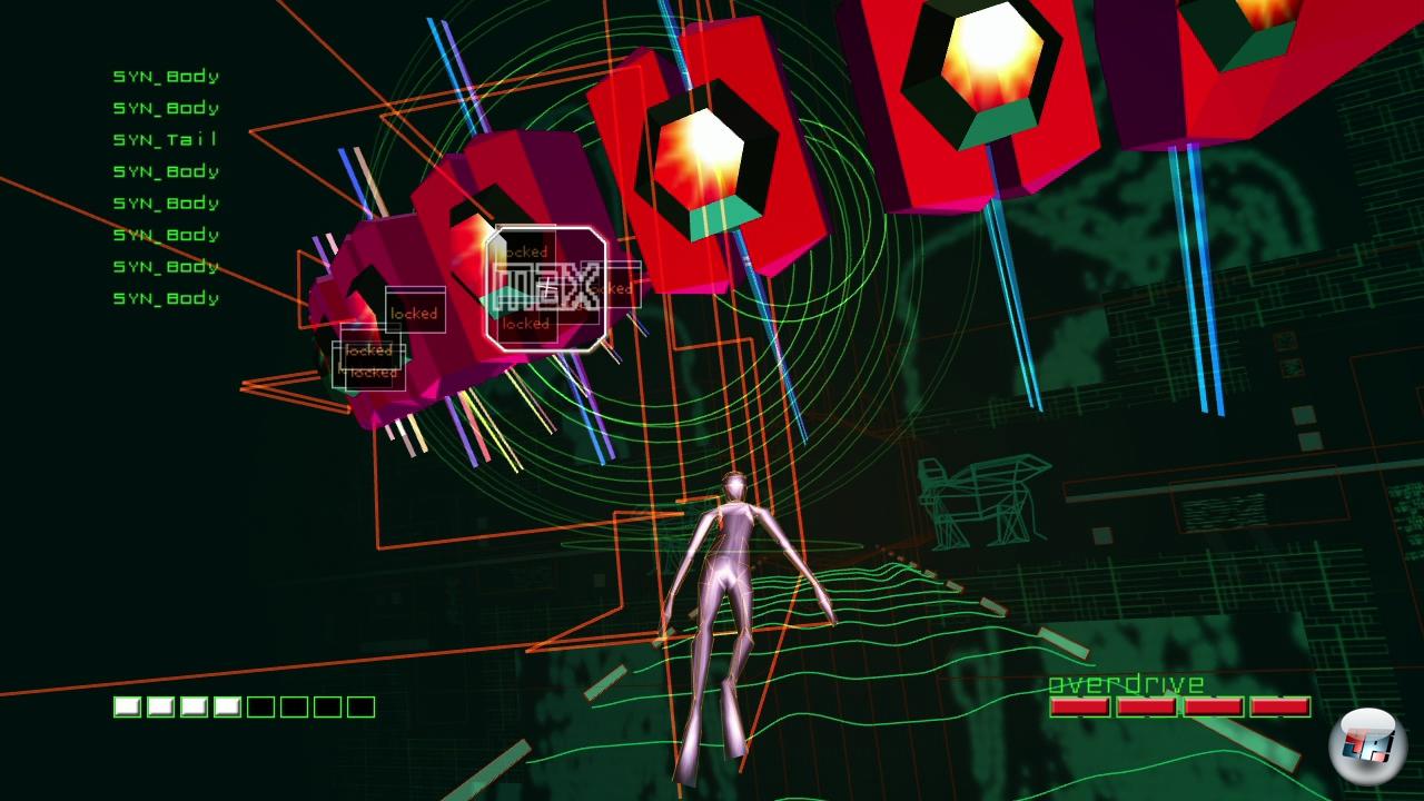 schwebender, tiefblauer Mecha-Adler breitet drohend seine Flügel aus. Da die Leiste mit Smart Bombs gefüllt ist, jage ich sicherheitshalber ein Exemplar in die Luft, um ja keinen der anderen, massenhaft auftauchenden Computerviren zu verpassen. Genau dieses Verfehlen will ich vermeiden. Da das reine Durchspielen an sich nicht all zu schwer ist, kommt es in Rez darauf an, möglichst viele Wiedersacher zu erledigen, sämtliche Items einzuheimsen um eine hohe Bewertung zu erzielen. Für meine Leistungen werde ich schließlich mit neuen Levels, Spielmodi sowie Grafik- und Sound-Spielereien belohnt.