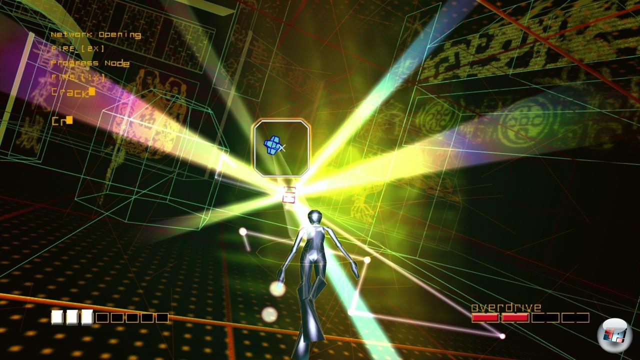 Während Hardcore-Zocker sich nach dem Durchspielen an der etwas schwereren Score-Attacke versuchen, gibt es auch eine Variante zum Chillen. Habt ihr eine Kunststudentin zu Gast, die noch nie ein Pad in der Hand hatte, kann sie sich im »Reise«-Modus austoben. Mit unendlich vielen Leben fliegt sie entspannt durch die ersten vier Levels und kann so ungestört entspannen und die Grafik genießen. Ihre spontanen Interpretationen müsst ihr dann allerdings alleine ertragen. Zitate finden sich einige in der Welt von Rez. Ein Endgegner erinnert mit seiner großen glühenden Säule in der Mitte unweigerlich an den riesigen Mainframe aus Tron. Eine andere Parallele erwähnen die Entwickler sogar im Abspann: Mit dem Design der Gegner wollen die Entwickler den abstrakten Bildern von Wassily Kandinsky huldigen.