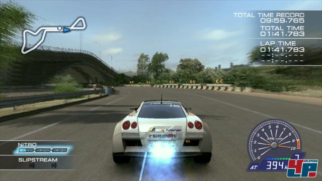 Die Fahrphysik ist ganz klar auf Spaß ausgelegt: Wie immer bei Ridge Racer steht auch bei diesem Teil das Driften ganz oben auf der Liste, wenn ihr über die Strecken heizt. Mit diesem leichtgängigen Manöver kommt ihr nicht nur schneller um die z.T. engen Kurven, sondern ladet gleichzeitig auch eure Boost-Leiste auf, in der ihr entweder bis zu drei Nitros sammeln oder eine einzige Leiste nach eigenem Ermessen aufbrauchen könnt. Die Steuerung funktioniert wie gehabt präzise und einfach – sofern ihr ohne die Bewegungssensoren lenkt. Ja, auch Ridge Racer 7 macht Gebrauch von den neuartigen Sixaxis-Fähigkeiten, aber auch hier kenn die Lenkung via Motionsensoren nicht mit der Präzision der Analogsticks mithalten