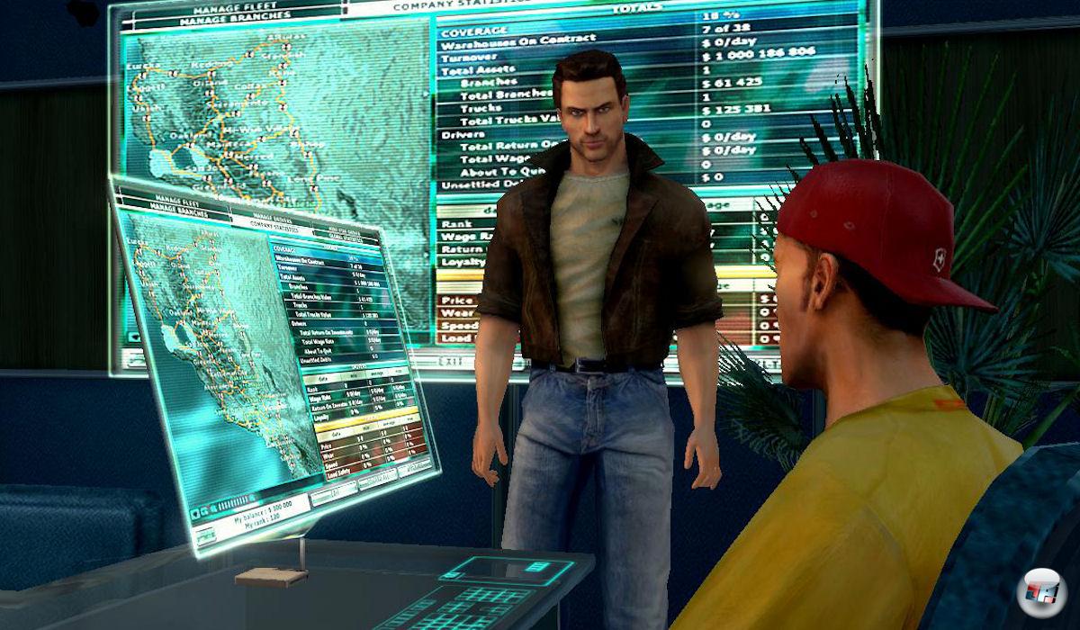 Die Erste Überraschung: Die Simulation spielt in der Zukunft! Kalifornien ist ein autonomer Staat, vermutlich mit Gouvernator Arnie als Präsident – umliegende Staaten spielen keine Rolle. Mit 40 Städten und über 12.000 Meilen Highways und Landstraßen (reduziert auf den Maßstab 1:10 = 1200 reale Spiel-Meilen) lässt sich das auch prima verschmerzen; es lässt sich auch so genug er“fahren“. In einer kleinen Intro-Sequenz lerne ich Matt kennen, einen alten Freund, der mir auf wundersame Weise eine komplette Spedition übereignet. Es bleibt offen, womit ich das genau verdient habe und auch die Herkunft der 200.000 Dollar auf dem Firmenkonto bleibt zunächst im Verborgenen. Na denn, wer will schon unnötige Fragen stellen, wenn einem so viel Gutes widerfährt? Abgesehen davon haben die Entwickler kaum Möglichkeiten der Interaktion in den Zwischensequenzen eingebaut, lediglich rudimentäre Ja/Nein-Antworten sind möglich. Nachdem ich schnell noch der Sekretärin vorgestellt wurde, finde ich mich auch schon am Steuer einer kapitalen Zugmaschine wieder, denn darum geht es ja schließlich: PS-Ungetüme möglichst unfallfrei von A nach B befördern. Ok, Ladung wäre auch ganz sinnvoll und so verwundert es, dass sich an der Zugmaschine kein Anhänger befindet. Weder das Intro noch die Anleitung klärt dieses Mysterium auf. Nach einer unnötigen Irrfahrt begreife ich, was das Spiel von mir möchte: Ich soll das nächstgelegene Depot der „California Commercial Warehouse Alliance“ ansteuern…. Aha! Kaum überquere ich das Tor, startet auch schon eine automatisierte Sequenz und mein LKW fährt wie von Geisterhand die Terminals an. Kein anspruchsvolles Rangieren, kein Ankuppeln des Anhängers wie beispielsweise im German Truck Simulator. Das ist zwar komfortabel, aber nicht realistisch.
