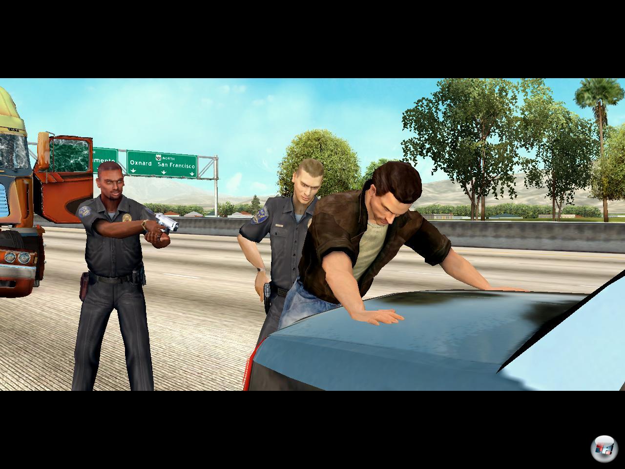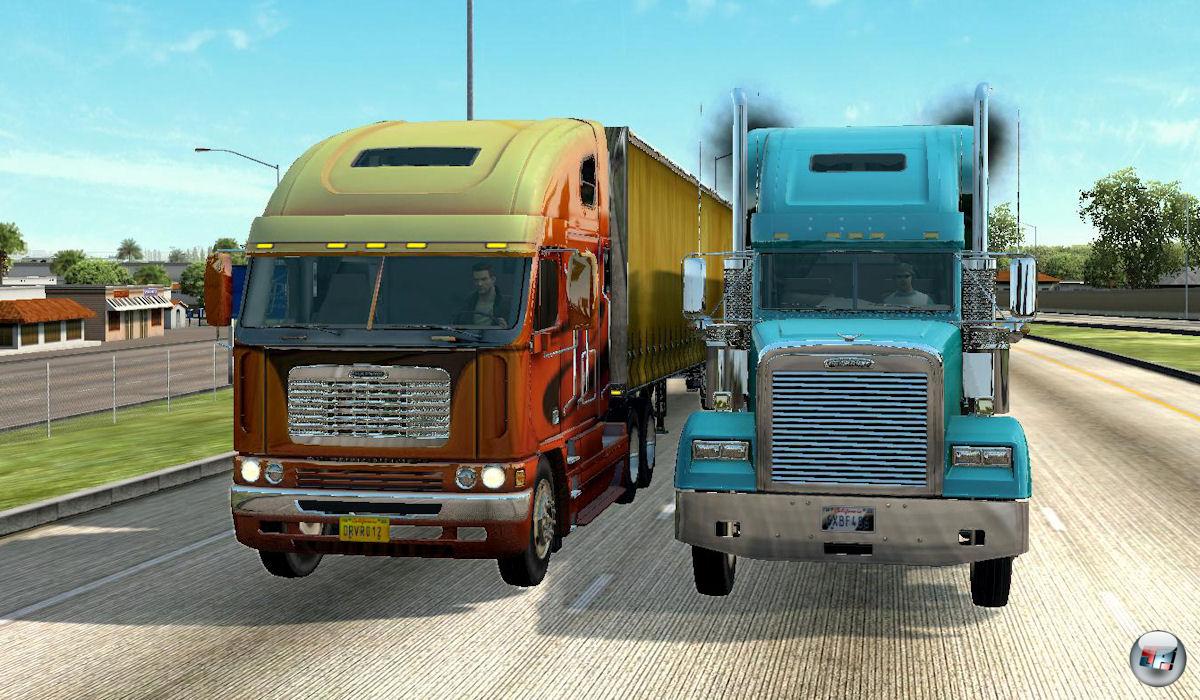 Bei der leichtesten Berührung eines anderen Fahrzeugs, unerlaubtem Fahrspurwechsel oder Missachtung der Vorfahrt ertönen auch schon im Hintergrund die charakteristischen Signalhörner der US-Highway Patrol. Dann heißt es rechts ranfahren, denn entkommen ist so gut wie unmöglich, eine geringe Chance hat man -wenn überhaupt- nur ohne Auflieger. Es folgt eine kurze Zwischensequenz, in der ich je nach Schwere des Delikts wie ein Krimineller vor dem Kofferraum des Streifenwagens „verhaftet“ werde, oder nur „normal“ zur Kasse gebeten werde… Gezahlt werden muss in jedem Fall und das mindert natürlich meinen Profit. Weitere Konsequenzen haben die Begegnungen mit den Gesetzeshütern aber nicht, Führerscheinentzug oder gar Zuchthaus drohen hier nie – es geht immer gleich wieder auf die Straße als wäre nichts gewesen. Das gilt allerdings nicht für den Truck! Ist es zu einer Kollision gekommen, sieht man das der Zugmaschine deutlich an. Je nach Schwere des Unfalls hängen Teile herab, sind Scheiben geborsten oder Stoßstangen verbeult. In gravierenden Fällen muss auch mal der Pannendienst gerufen werden, damit es weitergeht. Ansonsten lassen sich die Schäden in den zahlreichen Werkstätten wieder beheben – gegen harte Dollars natürlich. Dort lassen sich die Zugmaschinen im Spielverlauf auch in den Rubriken Außen- und Innendesign, Leistung und Sicherheit verbessern.