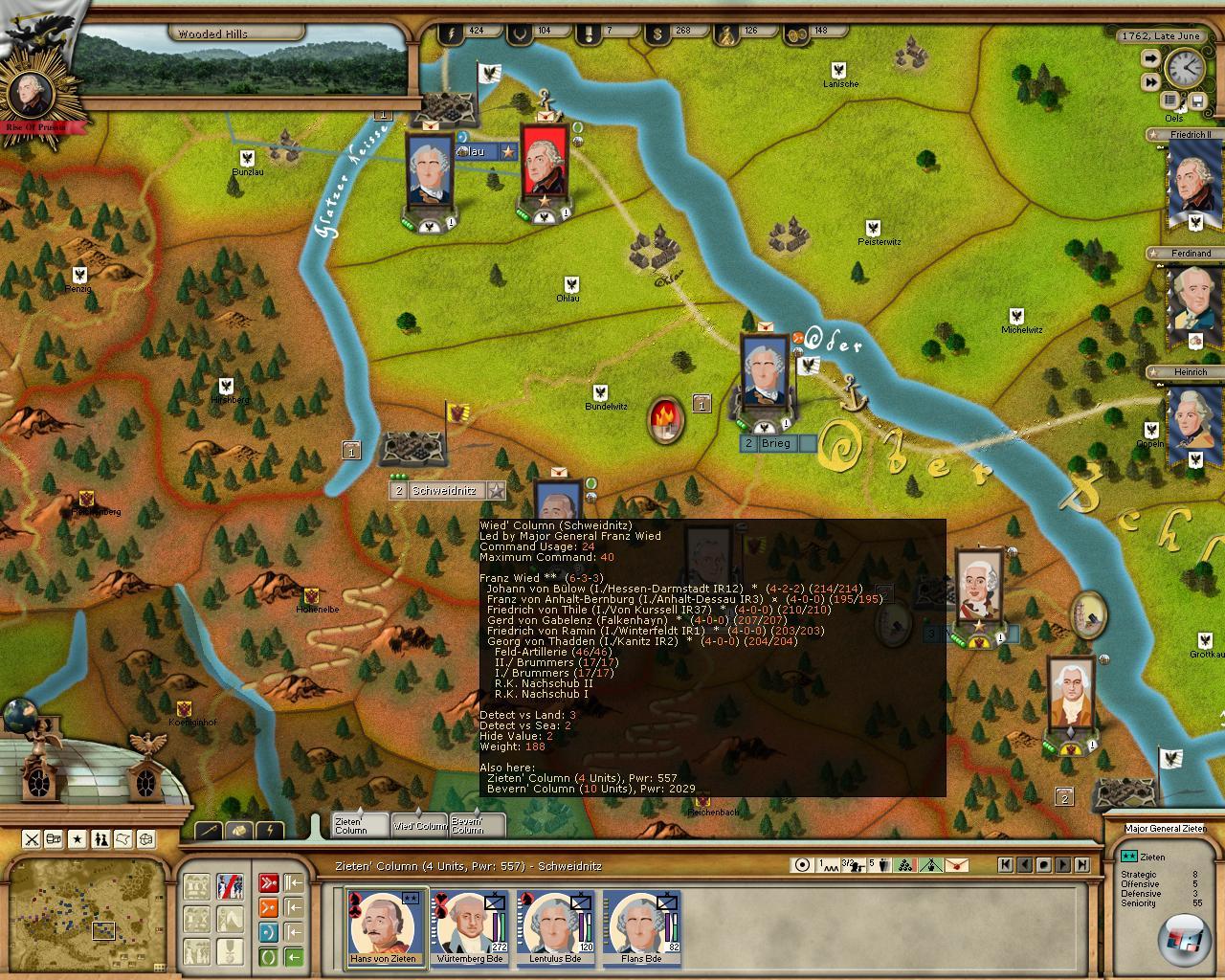 Am Anfang übersieht man oft das kleine Wesel, das auch dazu gehört und ganz am westlichen Rand der Karte liegt. Schickt man keine Verstärkung, wird es nach einigen Runden von den Alliierten eingenommen, die aggressiv sind und kein Pardon kennen. Überhaupt gilt es als Preuße, gleich flugs alles einzunehmen, was in Reichweite liegt, um dann nach Böhmen einzumarschieren und vielleicht Prag zu belagern. Als weiteres Ziel lockt Wien, was aber schon ambitioniert ist. Schafft man es nicht im ersten Jahr, werden die Vorstöße der Österreicher immer massiver: Überall tauchen gut gerüstete kaiserliche Armeen auf, die von weißhaarigen Offizieren kommandiert werden. Es dauert eine Weile, bis die Kaiserin ihre Truppen aus Italien, Kroatien oder Ungarn her verfrachtet hat.