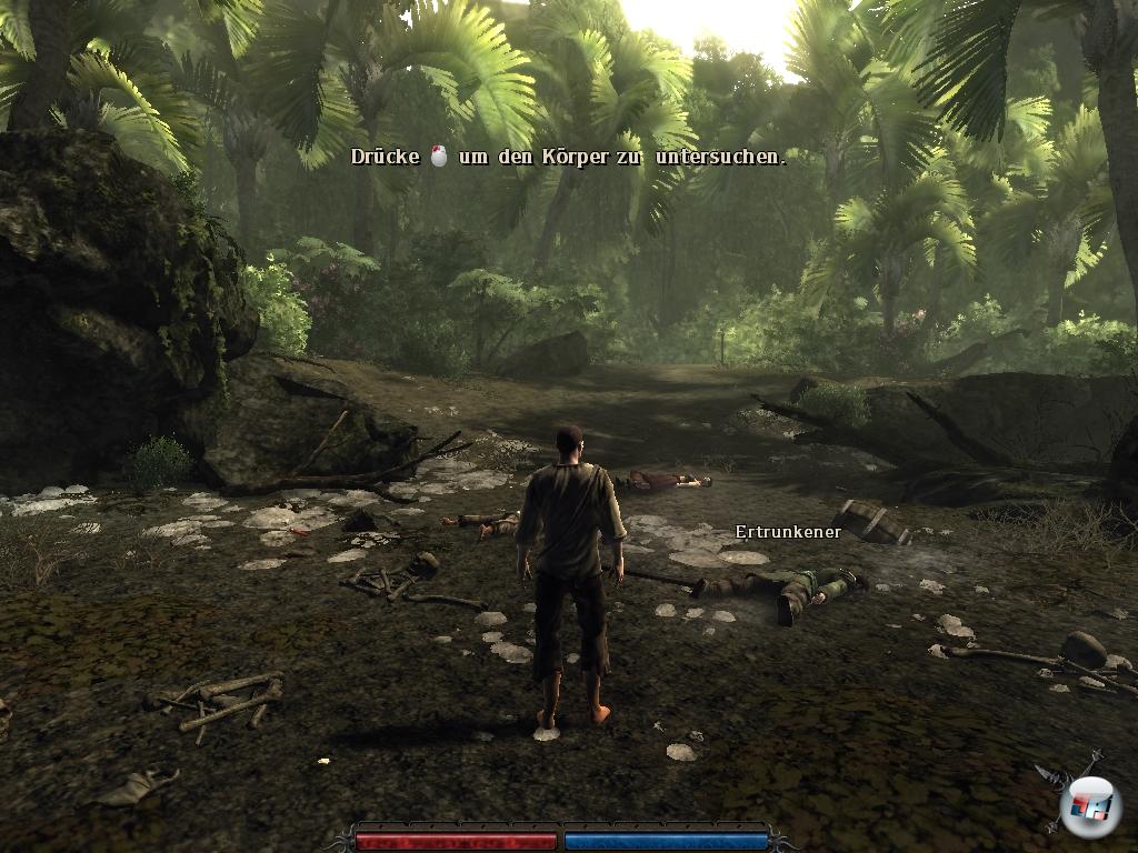 Zunächst ist man angetan vom karibischen Flair: Die Sonne lacht über riesigen Palmen, während die Brandung im Rücken des Helden rauscht. Diese exotisch anmutende Landschaft weckt die Vorfreude und das gute grafische Niveau wird auch später im Inselinneren gehalten: Freut euch auf eine lebendige Flora, auf eine weiß gekalkte Hafenstadt mit schäumender Gischt, ein Lager in vernebelten Sümpfen, eine stattliche Bergfestung samt Vulkan und vor allem sehr schönes Licht, das im Morgengrauen angenehm diesig durch den üppigen Urwald bricht.