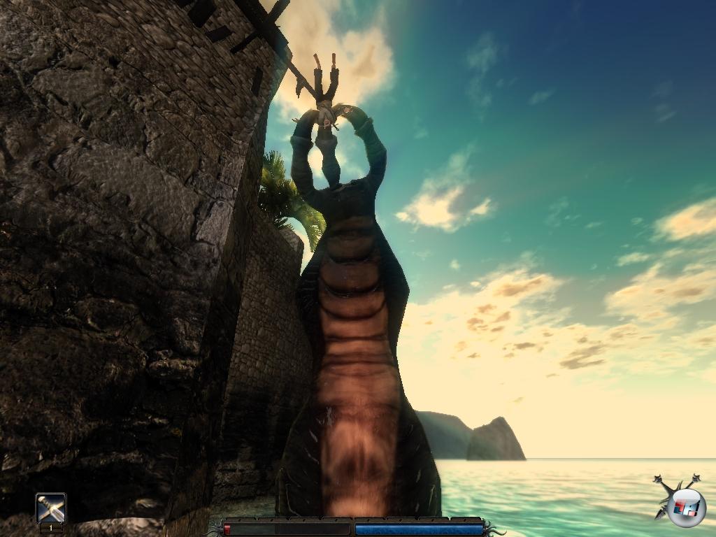 Schwimmen kann der Held genau so wenig wie reiten – und wer sich zu weit ins Wasser wagt, wird von diesem Wurm geschnappt.