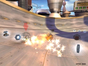 Für Probleme sorgt lediglich die gewöhnungsbedürftige Steuerung, da der Analogstick zu direkt reagiert und sich Rodney nur schwer kontrollieren lässt. Gerade am Anfang lauft ihr mit plötzlichen Richtungswechseln wie angetrunken durch die Gegend und springt auf Plattformen auch mal daneben. Steuerungstechnisch hat sich die GameCube-Fassung als erste Wahl erwiesen, da hier der Analogstick feinstufig abgefragt und damit die Befehle von der Spielfigur relativ präzise umgesetzt werden. Absolut katastrophal steuert sich Robots dagegen auf dem PC, wenn ihr kein DirectX-kompatibles Gamepad euer Eigen nennt. Dann nämlich müsst ihr auf die Tastatur als Controller zurückgreifen, während eine zusätzliche Maus nicht unterstützt wird. Was das für euch heißt? Nun, zunächst könnt ihr die analoge Steuerung eures Helden vergessen. Rodney hechtet immer im Laufschritt los, was es noch schwieriger macht, ihn unter Kontrolle zu halten. Am schlimmsten ist jedoch die Tatsache, dass ihr auch die Kamera mit der Tastatur bewegen müsst, wozu sich eigentlich die Maussteuerung perfekt eignen würde. Zwar gibt es eine Taste, die die Kamera auf Knopfdruck direkt hinter der Figur positioniert, doch bleibt die Kamera oft und gerne irgendwo hängen und lässt sich nicht weiter schwenken – das gilt übrigens auch für die Konsolenfassungen. Außerdem werdet ihr während des Spiels immer wieder von Gegnern hinter Ecken überrascht, weil ihr sie durch die verkorkste Kamera nicht sofort sehen könnt. Zwar habt ihr die Möglichkeit, in eine Ego-Ansicht umschalten, doch könnt ihr euch in dieser nur umsehen, nicht aber bewegen.