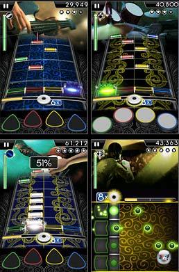 schnellen Spiel oder der kurzen, linearen Karriere eingesetzt werden. Und nach wie vor ist das Hauptziel, wahlweise als Bassist, Drummer, Gitarrist oder Sänger im Rhythmus der Musik die auf einem „Highway“ nach unten bzw. als Vokalist von rechts nach links laufenden Noten anzuschlagen. Wie schon bei PSP oder DS wurde dabei die Anzahl der „Spuren“ auf vier reduziert, während die stationären Rocker mit fünf Spuren konfrontiert werden.![]()
