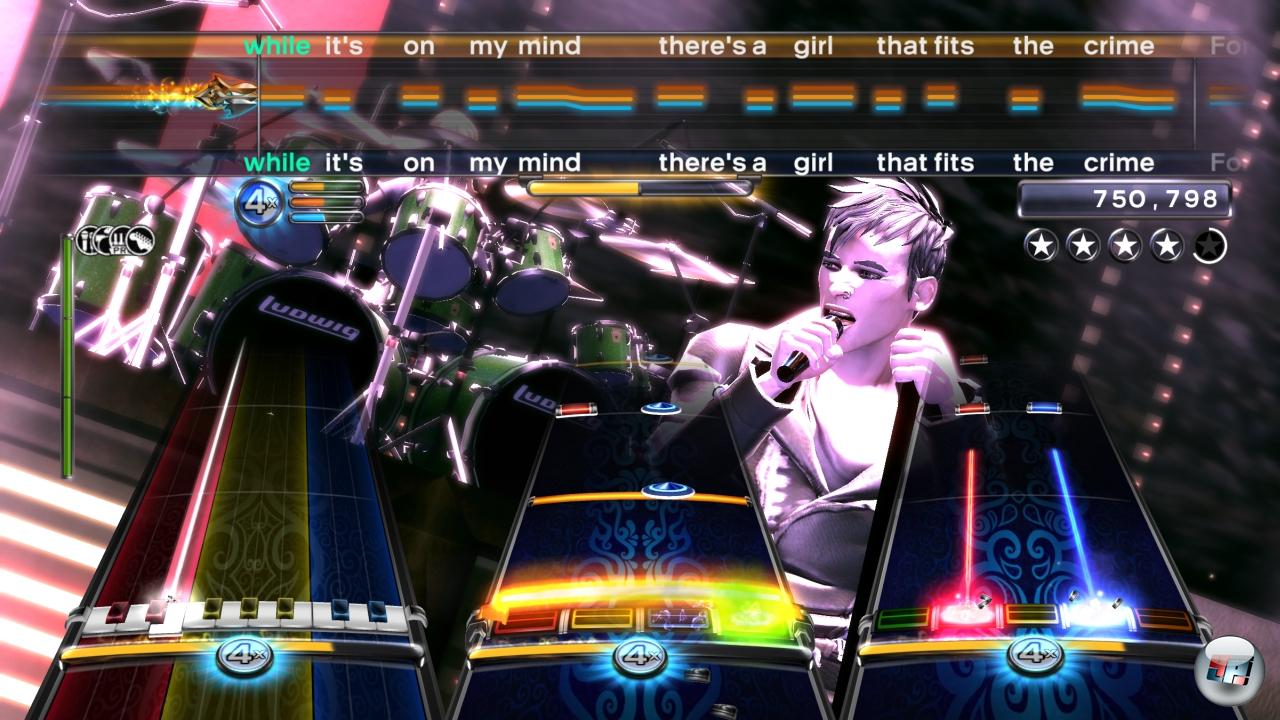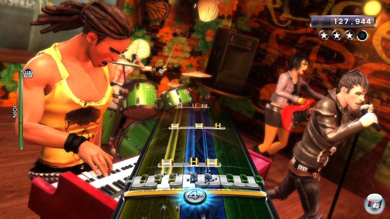 Daher ist dieser Modus nur mit entsprechenden Instrumenten zugänglich, die wir in unserem Special unter die Lupe genommen haben, sprich der roten Fender-Mustang mit 102 Bundknöpfen, alternativ auch der echten „Squier by Fender Stratocaster for Rock Band 3“ (gegenwärtig noch nicht erhältlich), dem Keyboard oder dem neuen (alten, sprich: RB2- oder Beatles RB-) Drumset mit drei Zimbeln.